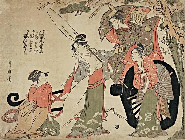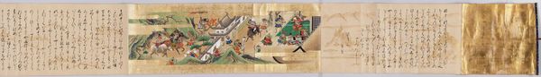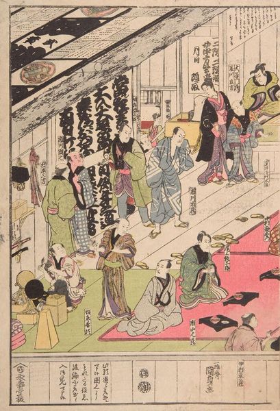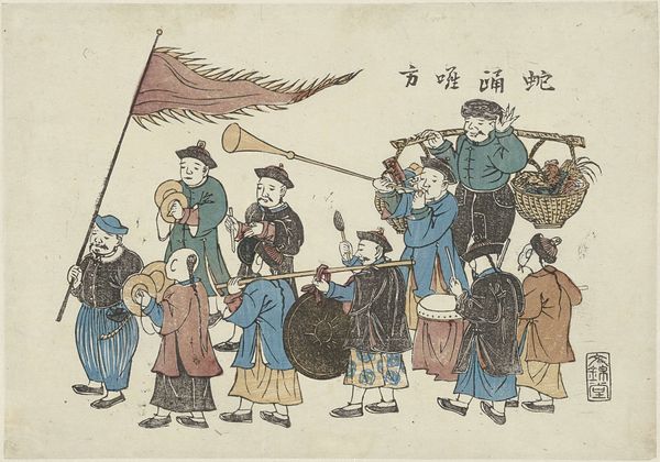 Curator: This is a woodblock print entitled "Procession of a Ryukyuan Ambassador," published by Izumiya Ichibei. Editor: It strikes me as both festive and slightly unsettling, given the formal rigidity of the procession. The scale is impressive, too. Curator: Indeed. These processions were significant displays of power and diplomacy. Ryukyu, now Okinawa, was then an independent kingdom with close ties to both China and Japan. Editor: So, the procession served as a visual declaration of Ryukyuan identity and sovereignty in a complex geopolitical landscape? Curator: Precisely. Every detail, from the attire to the objects carried, served a symbolic purpose, communicating status, allegiance, and cultural distinctiveness. Editor: It makes you wonder about the lived experiences of those participating. Were they proud representatives or pawns in a political game? Perhaps a bit of both? Curator: That ambiguity is precisely what makes this print so compelling. It offers a glimpse into a world of ritualized encounters and carefully constructed identities. Editor: Examining the historical context certainly provides a more nuanced understanding of what at first appears to be just a colorful scene. Curator: It’s a reminder that art is never created in a vacuum. Editor: And that engaging with historical artworks can help us grapple with contemporary power dynamics.