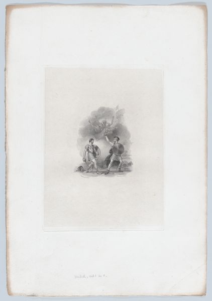Editor: This is “Falstaff and Bardolph, on a Road near Coventry” from 1825, after Charles Heath the elder. It looks like a print, based on a drawing maybe with watercolors. It’s a simple, almost stark image; I wonder about the historical context beyond just illustrating Shakespeare. What do you see in this piece? Curator: I see more than just a simple illustration of Shakespeare. This print becomes a powerful reflection on social dynamics of its time. The positioning of Falstaff, a symbol of unchecked indulgence, and Bardolph, almost like a resigned subordinate, invites us to consider the class structures and the exploitation inherent within them. How does this power dynamic resonate with contemporary society? Editor: So, you're saying it is not only an image of two characters but an active commentary? Curator: Precisely! Consider the rise of industrial capitalism at that time. Falstaff could be interpreted as an embodiment of early capitalist greed, while Bardolph is representative of the exploited working class. How do you think their interactions, as portrayed here, reflect the broader anxieties about economic inequality and social justice during the Industrial Revolution? Editor: I hadn't considered it that way at all! The seemingly simple interaction takes on so much more meaning. Curator: Absolutely. Think about how the artist uses Shakespeare to subtly critique the present. Even their attire, their burdens, their shared journey—they speak volumes about the realities of that era. What could this artwork suggest about the intersection of art, literature, and social critique? Editor: Wow, I'll never look at Shakespeare illustrations the same way again. Thanks, that gave me a lot to consider! Curator: My pleasure. Let's both continue to look at art with the intention of seeing how it reflects historical truths.