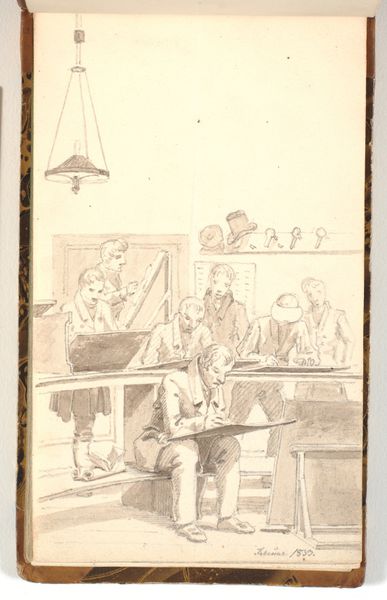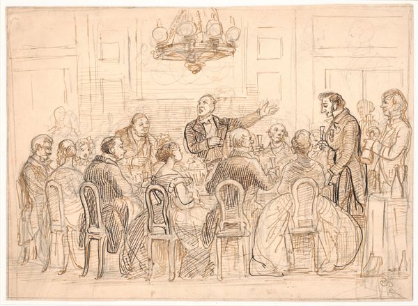 Curator: This intriguing ink drawing is entitled "Collegium politicum," also known as "The Political Tinker," by Wilhelm Marstrand. It dates from 1865-1873. Editor: The sepia tones give it the feel of looking at history, doesn't it? Almost like seeing an image fading in your memory, just on the verge of disappearing. Curator: It's Marstrand's depiction of a scene from Ludvig Holberg's satirical play "Den Politiske Kandestøber." The story revolves around a tinker who dreams of being a politician. Editor: Dreams might be too gentle a word here. The fellow standing at the table, jabbing his finger and sounding off... He seems absolutely consumed by it. His stance... that cap askew! It's a performance, or at least a really fervent delusion of grandeur. And note all the attentive faces – it really gives the artwork that kind of stage-play sensation you describe. Curator: Exactly! The artist captures a lively genre scene full of societal observation. But Marstrand isn't just illustrating a play; he's offering a commentary on political ambition and social climbing. See the expressions of those around the table? Some amused, some contemplative, others perhaps a touch skeptical. Editor: Skeptical, perhaps, but certainly not rebellious. They let him bluster on, caught in their own considerations... They’re trapped, I suspect, in an environment where a loud performance wins attention and influence... Look closer! Each figure surrounding that table reveals a universe of silent gestures, conveying diverse yet intertwined ideas and perspectives on the performance. All in that shared space... Curator: Precisely. And did you notice the objects in the background? The clock, the picture on the wall—even the way light falls on the doorway—these carefully chosen details deepen the narrative and contribute to the overall mood. Editor: The clock is really crucial; that insistent, unceasing ticking – it embodies the temporal vanity of the protagonist! I hadn’t even seen the horse portrait at the entryway—a subtle comment, then, on our speaker’s true class status, juxtaposed against his lofty goals. Curator: Ultimately, it is a rich depiction. There is always more to discover about ourselves and our societies. Editor: Yes! Seeing through each other’s symbols, we’re more likely to truly understand our narratives, too. A compelling illustration.