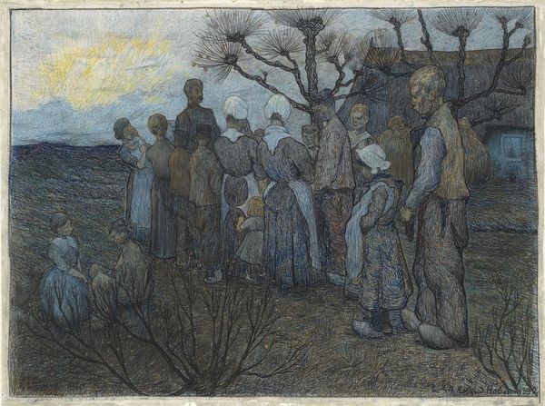 Editor: We're looking at Viggo Johansen's "Konfirmations-söndag. Dragör", painted between 1876 and 1880. It's an oil on canvas currently residing at the Statens Museum for Kunst. The atmosphere feels somber, almost muted, and the composition is interesting with that stark division between the two groups. What do you see as key compositional elements? Curator: Note the formal structure Johansen employs. Observe the horizon line—how it bisects the canvas, establishing a dialogue between the earth and the sky. Then, trace the directional lines created by the figures themselves. The way the subjects on the right lead the eye towards the horizon. What effect is created? Editor: I see how the darker figures on the right contrast with the lighter tones near the horizon line, drawing the eye into the distance. What does that do to the spatial arrangement of the painting? Curator: The painting also contrasts textures, doesn't it? Notice the broad brushstrokes of the sky against the finer details of the figures' clothing, it contributes to a visually rich surface, where flatness and depth interplay in intriguing ways. Where does this materiality become important? Editor: Perhaps in creating a sense of intimacy within such a large group of figures? Or maybe in drawing the eye into those three central women? They definitely command my attention! It also contrasts their subdued colors with the lightness of the sky. Curator: Exactly. What else strikes you? Think about the arrangement of colors, or about the relation between shadow and light within the composition. Do they evoke certain formal values or suggest new interpretations? Editor: I see a study in contrasts – dark and light, foreground and background, static figures versus implied movement, which results in a formal tension across the canvas. This elevates it beyond just a snapshot of a confirmation Sunday, wouldn’t you agree? Curator: I concur. These relationships offer us insights beyond the mere subject matter; it is how Johansen manipulates the very language of painting that provides such richness to this work. Editor: It's fascinating how the formal aspects create such a deep feeling, despite the simplicity of the scene itself.
