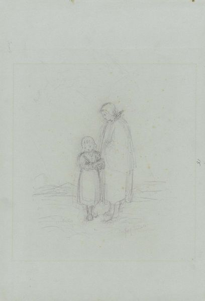 Curator: Before us, we have Martinus Rørbye's "Woman and Little Girl from Saracina near Tivoli," dating back to 1840. It’s a pencil drawing on paper, offering a glimpse into the artist's travels and observations. Editor: It feels incredibly intimate, almost like catching a private moment. The soft pencil strokes give it such a gentle quality, like a memory fading at the edges. I'm immediately drawn to the mother’s face; there's a quiet strength there, isn't there? Curator: Rørbye was a keen observer of local life and costume. Look at the details in their garments—the layers, the textures suggested through minimal shading. It reflects a romanticized realism, carefully documented yet imbued with feeling. These rural Italian costumes carry so much information. Editor: Exactly, and those costumes become a kind of silent narrative, don't they? The head covering the woman wears hints at tradition, perhaps modesty, and is such a contrast to the free-flowing dress of fashionable Copenhagen women at the time, wouldn't you say? There is something touching about how self-possessed the little girl appears as well, firmly planted there next to her mother. I keep coming back to this, this drawing captures such tenderness with such economy. Curator: What’s remarkable is how he uses a relatively simple medium—pencil on paper—to convey so much. This work really highlights how even humble materials, wielded skillfully, can document social practice and class difference with so much artistic purpose and visual weight. Editor: Absolutely. You see the everyday, the lives lived in those clothes. It’s a quiet sort of beauty. Curator: This work makes me reflect on how, even in seemingly simple subjects, artists can reveal layers of meaning about social structure, observation and material culture through the skilled manipulation of readily accessible materials. Editor: It stays with you, doesn't it? This beautiful drawing; a gentle echo of a world, seen so long ago.