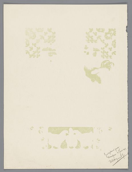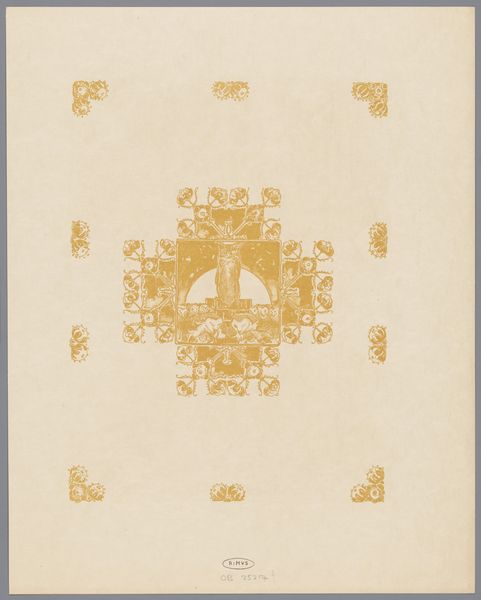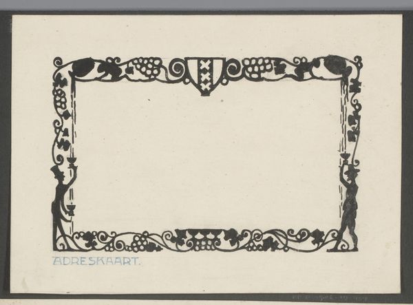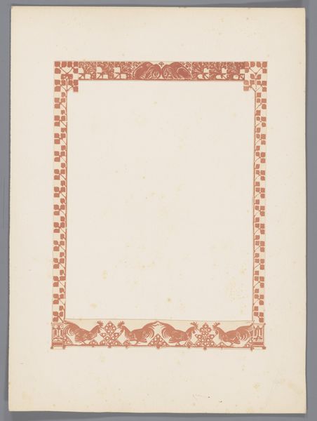 Curator: Welcome. Today we are looking at a work by Bernard Willem Wierink, a proof print for a page from Reinaert de Vos, dating from around 1910. It is currently held at the Rijksmuseum. It’s crafted with ink and watercolor on paper, a beautiful example of decorative art from the Art Nouveau period. Editor: My initial reaction is a sense of quiet elegance, like a whisper from the past. The aged paper itself seems to tell a story. And those geometric, stylized borders are giving me all sorts of fairy-tale vibes, reminiscent of royal stationary—but unused, unfinished. What story was meant to go here? Curator: Indeed. The 'Reinaert de Vos' cycle itself is fascinating. These tales, deeply rooted in Northern European folklore, offered a biting satire of medieval society. By assigning animal traits to human types—the cunning fox, the brutish bear—Wierink, even with this 'blank canvas' as it were, participates in a long tradition of critiquing power structures, reflecting the era's socio-political anxieties. Editor: So this isn't just about decoration; it’s a frame meant to house subversive storytelling? The thought of a wily fox as the main character gets my mind spinning— especially imagining the story enhanced by those beautiful art nouveau lines. Almost like visually sweetening the rebellious undertones with style! Curator: Precisely! Art Nouveau, as a style, often flirted with counter-cultural ideas, challenging academic traditions while seemingly embracing the beautiful. And by extension, decorative frames like this can hold stories within them, shaping the narrative. A story where the weak, through wit and deception, topple the powerful is certainly still resonant. Editor: It makes you think about how stories are framed, not just literally here in the artwork, but metaphorically. Which voices are heard and how are they presented to us? Is the frame itself a tool of manipulation, or empowerment? Food for thought! I look at it now in a completely different way! Curator: It does give one pause. In a society obsessed with narratives—their construction, their propagation—an image such as this serves to reminds us to examine every border, and that no element, not even a decorative one, exists in a vacuum. It reflects an urgent invitation to think critically, pushing beyond surface level meaning. Editor: Absolutely. This seemingly delicate print sparks bold considerations! From just a quick glance, you may only observe elegance, yet so much lies within. The unwritten tale and potential frame manipulation makes one aware. It truly makes the gears start turning. Curator: Indeed. Thank you for your thoughts. Editor: The pleasure was all mine.