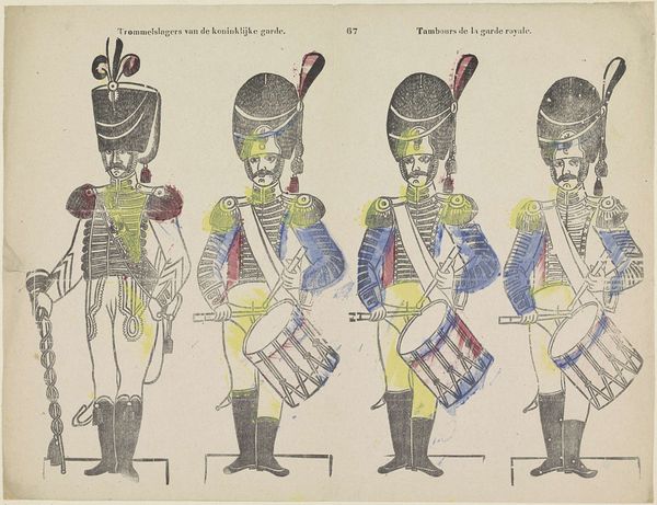 This print, titled Infanterie, was made by Lutkie & Cranenburg, using the technique of lithography, a method that democratized printmaking in the 19th century. Lithography allowed for relatively quick and inexpensive reproduction of images, making art more accessible to a wider audience. In this instance, rather than fine art, its focus is documentation of military uniform. The print meticulously depicts the uniforms of the Dutch infantry, showcasing the details of their design, from the cut of the jackets to the placement of buttons and the trimmings on their hats. The choice of lithography speaks to the practical purpose of the artwork. It wasn’t intended as a luxury item, but as a tool for disseminating information, perhaps for military personnel or those interested in the visual culture of the armed forces. This print exemplifies how artistic techniques intersect with social needs, blurring the lines between art, craft, and documentation.