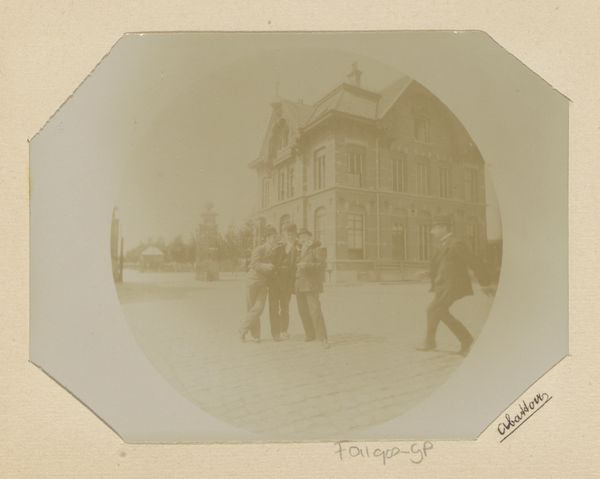 This photograph captures pedestrians on the Rokin in Amsterdam, near the Langebrugsteeg. It was taken by Johanna Margaretha Piek. The sepia tone and the octagonal vignette give the image an old-fashioned feel, drawing our attention to the composition. The positioning of the figures – a man and woman walking, and two children to the side – creates a subtle rhythm. The buildings in the background are structured horizontally, offering a stark contrast to the organic, rounded edges of the photograph itself. The composition frames the everyday scene, elevating it to a study of form and light. The use of a vignette, a technique of softening the edges of an image, seems to function here to isolate a fleeting moment, a fragment of urban life observed through a particular lens. Piek’s work thus destabilizes the traditional function of photography as a straightforward record, and instead invites a meditation on time, perspective, and the constructed nature of seeing. Ultimately, the photograph uses its formal structure to prompt deeper questions about how we perceive and remember the world around us.