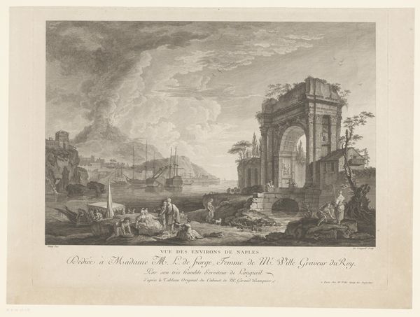 This print, ‘Haven met klassieke architectuur’, was made by Nicolas Perelle in the 17th century using etching. It is a printmaking technique that uses acid to corrode the unprotected parts of a metal surface to create a design in the metal. The image shows a harbor scene with classical architecture, revealing Perelle's interest in architectural subjects. The fine lines create intricate details in the scene, from the sun breaking through the clouds to the stone blocks of the harbor, giving a sense of depth and texture to the artwork. The figures on the pier and in the boats suggest a bustling harbor scene with workers loading and unloading cargo, hinting at the economic activity and labor of the port. Ultimately, considering the material processes of printmaking reminds us that art is not just about the image, but also about the labor and technical skill that goes into its production, challenging traditional distinctions between artistic practices.