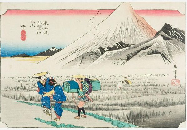 Utagawa Hiroshige made this print, Hara, using woodblocks and colored inks. The process is a relief printmaking method, where the areas that are not meant to be printed are carved away, leaving the design raised on the block. This technique has a long history in East Asia, predating its use in Europe by centuries. Here, the flat planes of color and the crisp lines are a direct result of this method. Think about the labor involved: each color requires a separate block, meticulously carved. The registration, ensuring each color aligns perfectly, demands exceptional skill. The very nature of woodblock printing lends itself to a graphic style, where clarity and precision are paramount. Yet, Hiroshige masterfully uses this technique to capture the atmospheric perspective and the vastness of the landscape, creating a sense of depth with simple means. This work invites us to consider the intersection of craft, art, and the social context of its production.