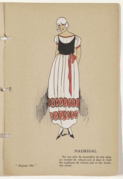 This fashion plate by G-P. Joumard was made circa 1921, using watercolor, gouache, and graphite. It depicts a dress design of black velvet and ivory crepe de Chine. Consider the materials involved, and the labor required to make them. Silk crepe production was already industrialized in the early 20th century, with Chinese silk farms feeding mills in Europe. Velvet, too, while luxurious in appearance, was manufactured in quantity. The relative availability of these textiles allowed for complex designs like this one, with its layered skirt. The fashion plate itself served as a prototype, a vector of industrial production. It reflects the era's changing social norms, as women sought liberation and new styles of dress. Joumard’s design speaks to a rising culture of consumption, where the latest fashions were accessible, at least aspirationally, to a wider public. Looking at this image, we are reminded that even the most ephemeral of designs has roots in very material conditions, and reflects the society that produced it.
