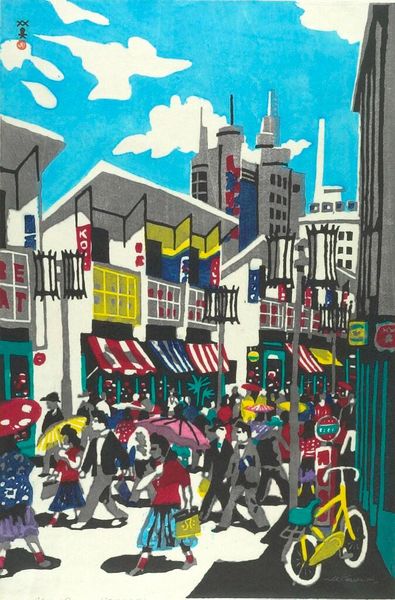 Curator: So, let's turn our attention to "The Hometown of Shakespeare" painted in 1992 by Wu Guanzhong. It's a captivating mixed-media piece. What jumps out at you initially? Editor: It's all about the vertical lines! At first glance, the stark, almost brutal contrast of the black and white stripes dominating the composition makes it feel… claustrophobic, maybe a bit agitated. Is this really a celebration of the Bard? Curator: Well, Wu’s often playing with this tension, I think. See how he abstracts the Tudor architecture, those iconic timber-framed buildings of Stratford-upon-Avon? He’s distilling the essence of the place, those rigid structures but through this chaotic dance of line and form, using mixed-media to achieve these striking contrasts. I see more lyricism than you. Editor: But look closer; what are these materials doing? The black almost suffocates any lightness, the painting looking like a jail, or perhaps emphasizing the labor behind building it all up! It brings forth not only the beauty but also a sort of critique behind art production. I guess that's Shakespeare after all? Curator: Yes! He’s not just giving us a postcard view. There's also the human element represented through those smudges and vibrant spots of color toward the bottom that make up something close to people! It creates depth but also a kind of vibrancy amongst that strict geometrical background! Editor: These human forms made of splashes! They could easily just suggest labor exploitation and commodification: those splashes give the work a hectic air; there is also some kind of suggestion regarding the working environment. Curator: I can see that! But I think those splashes breathe life into it! And this hectic environment that you are mentioning can as well, resemble something closer to beauty in this modern urban setting! Editor: It gives us much to think, indeed. And the fact that the work, as mixed-media is less defined... Curator: It blends into this ambiguous modern portrait, a constant negotiation of place. I now have more layers to my perspective regarding its making! Editor: Likewise! A dialogue I wish would not come to an end...