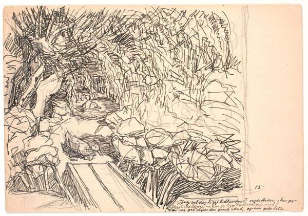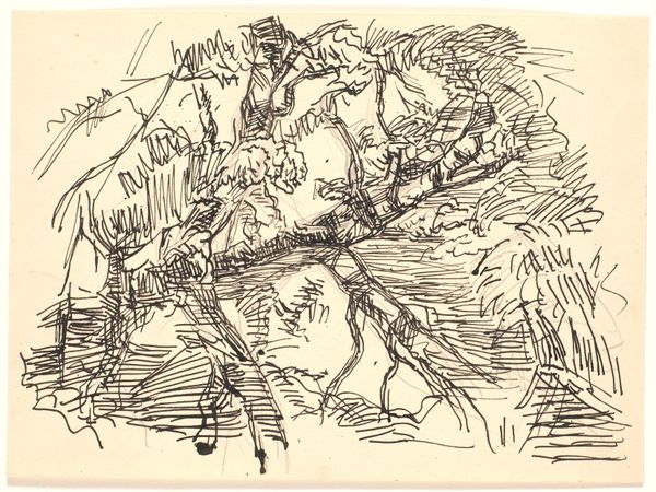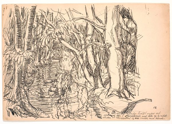 Curator: Looking at this drawing by Fritz Syberg, entitled "Da følte den sig ganske undseelig...", created in 1928, one immediately notes the delicate application of ink on paper. It is currently held at the SMK - Statens Museum for Kunst. Editor: My first impression is of quietness. The landscape feels very intimate, like stumbling upon a hidden little scene in nature. It's almost claustrophobic with all of those trees drawn closely together, but tranquil too because of the water. Curator: The rapid, sketchy ink work belies the sense of serenity you describe. One senses the quick hand and repeated lines indicative of a more involved creation than simply a spontaneous record. This reveals something of the materiality, the layered labour in rendering the landscape visible through mass production methods of drawing, sketching, and ink application. Editor: Absolutely, I can see the layered labor in the texture! And I think what I'm picking up on in that atmosphere is created, too, through Syberg’s specific, detailed observations of nature. He is using dense thicket to hint at that sense of smallness that he included in the drawing title; 'Then it felt quite insignificant...'. Curator: And what of the landscape's relationship with early 20th century Danish rural economies and access to artistic means for those whose lifestyles reflect them? Were his depictions reflecting societal challenges to that lifestyle at the time, or perhaps simply documenting changing industrial demands? Editor: Perhaps both. Syberg did choose to move out to the country when it wasn’t that popular, creating an art colony in Fünen with his wife. It suggests a connection to craft and an appreciation of the handmade versus mass production. Though the text at the bottom of the artwork may further imply that the author sees themselves within the landscape. Curator: True! And ultimately it's how those interpretations are shaped through distribution that makes art matter! Editor: I guess we just want our experiences to resonate with others, to remind ourselves we aren't alone, quite like how this image and its title suggest in its moment in time.