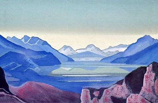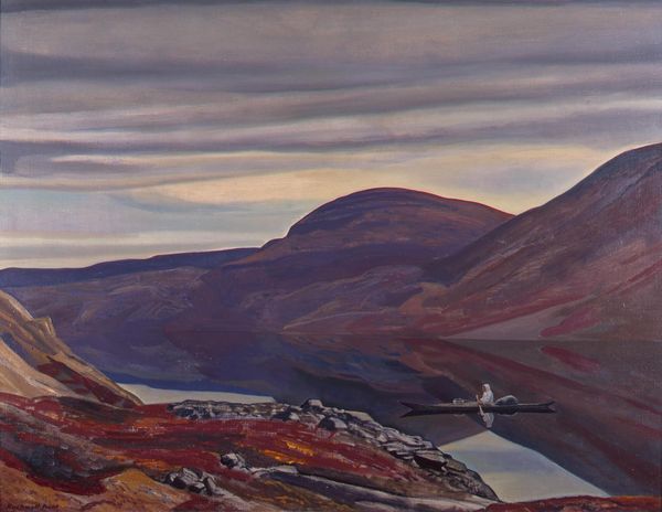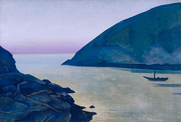 Nicholas Roerich created this landscape, Monhegan, using oil paints on canvas. The smooth, consistent surface suggests that he may have prepared the canvas with gesso to create a receptive ground, allowing for the even distribution of pigment. The colors and forms are applied in large, simplified shapes, with a sensitivity to the materiality of paint. The earthy, muted tones of the landscape, combined with the fiery oranges and reds of the sky, give the painting a warm, almost meditative quality. The mountains, rendered in broad strokes, seem to emerge from the canvas, their solidity emphasized by the artist's deft handling of light and shadow. There is also a sense of skilled labor involved in the blending of colors and creation of texture, yet the final image departs from detailed realism, hinting at the artist’s vision. Ultimately, it invites us to consider how the simplest of materials, when manipulated with care, can evoke a powerful sense of place and emotion, bridging the gap between craft and fine art.