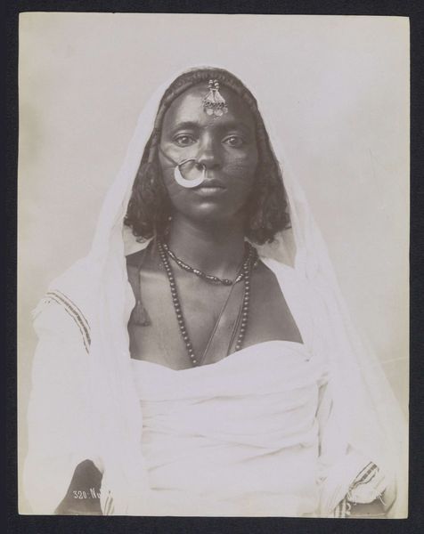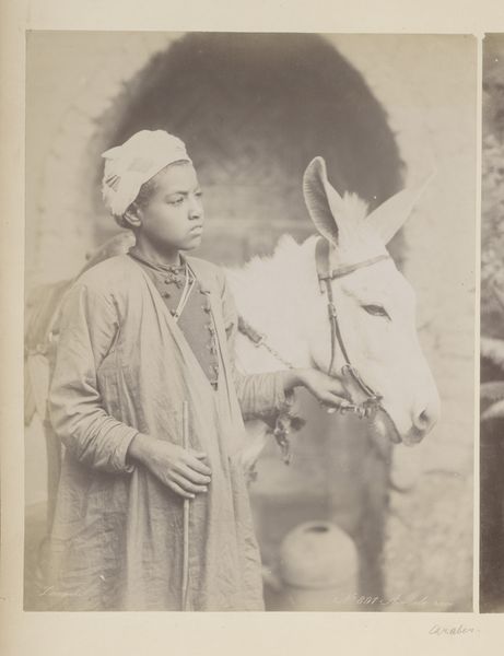 Editor: This striking photograph, “Portrait of an Unknown Man of the Besharin Tribe,” was captured sometime between 1870 and 1900 by C. & G. Zangaki. The subject's gaze and the stone wall backdrop create a sense of stoicism. How does this portrait fit into the broader context of image making at this time? Curator: It’s essential to remember photography's role in the colonial project. These types of portraits, ostensibly documenting “exotic” cultures, often served to reinforce a Western sense of superiority. Think about how these images circulated - not within the Besharin community, but in European drawing rooms and world exhibitions, reinforcing specific ideas about race and otherness. How do you think that affects our reading of the photograph today? Editor: That's sobering. It makes me wonder about the power dynamic involved. Was this man compensated or given agency over how he was presented? The composition, with its staged backdrop, now seems less about capturing reality and more about constructing a specific narrative for a Western audience. Curator: Precisely! It's crucial to analyze the visual language – the deliberate choice of attire, the carefully chosen backdrop. All contribute to a curated representation of the “Other.” Whose story is really being told, and who benefits from its telling? What ethical implications do we need to consider? Editor: I never thought about it that way before. This photo, initially just an interesting portrait, now prompts a deeper reflection on the historical forces at play during its creation and reception. Thanks! Curator: Absolutely, the best art prompts such critical dialogue with our history, constantly challenging our assumptions. The camera, though intending to reflect reality, is always caught within layers of historical complexity.