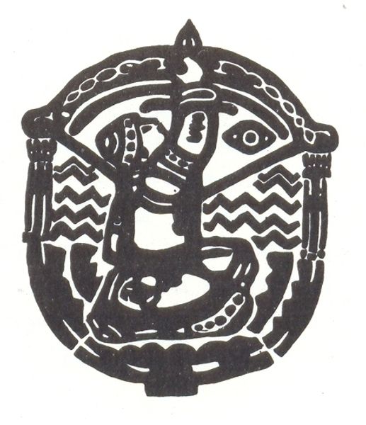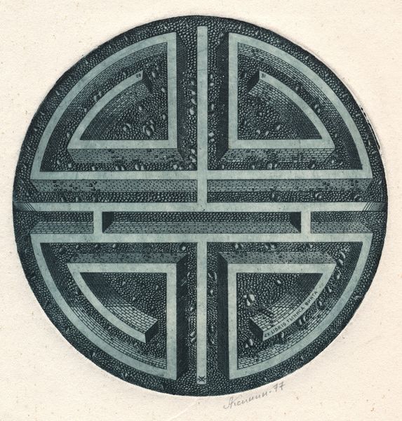 Editor: Here we have Nicholas Roerich’s 1918 ink drawing, "Vignette for book 'N. K. Roerich'." It has such a bold, symbolic quality, like a crest or an emblem. How do you see its role as a statement, particularly considering its purpose within a book about the artist himself? Curator: It's crucial to consider the context of 1918 Russia, amidst revolution and immense social upheaval. Roerich, deeply interested in spirituality and theosophy, often used symbolism to communicate ideas about universal connection and inner peace, which resonated with intellectuals searching for stability during the political turmoil. Wouldn’t you agree it’s almost a defiant declaration of spiritual values? Editor: Absolutely. The stylized figures and geometric shapes remind me of ancient cultures. It seems very intentional. Is this an effort to connect with a larger human history beyond the immediate conflict of his time? Curator: Exactly! Roerich was greatly inspired by early Russian and Asian cultures, viewing them as sources of profound wisdom. In his vignettes, that link to what he understood to be universal spiritual ideas became central. Given his own book was essentially propaganda for the movement he led, do you feel that there might be less of this “inner peace” than initially interpreted, especially given the strong symbol on this artwork? Editor: I didn't think about that but maybe that explains the somewhat militant impression this work left me with. Curator: And do you agree it's interesting to consider how Roerich’s symbol-laden art was later embraced – and arguably, misinterpreted – within different political agendas? Editor: Very much so. Understanding that historical backdrop really changes my interpretation of Roerich's choice of subject and its public reception. Curator: Indeed, examining the artwork’s history gives us greater context and insight to these complex themes.