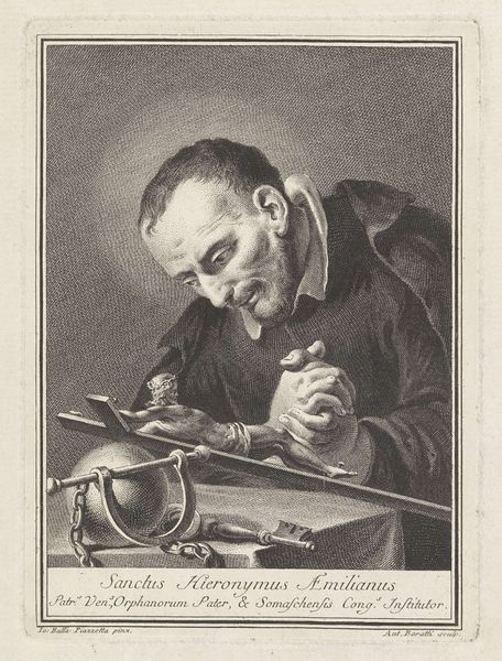 This print, "Heraclitus met een passer," was made in the 17th century by Bernard Vaillant. It's created using mezzotint, a printmaking technique that allows for rich tonal variations. Vaillant likely used a tool called a "rocker" to create a dense field of burrs on the copper plate. By selectively burnishing or scraping away these burrs, he was able to control how much ink the plate would hold in certain areas, creating the image's light and shadow. The laborious nature of mezzotint meant that prints were more costly than simpler etched works. This, combined with the skill required to master the technique, elevated the status of printmakers like Vaillant. The very process of mezzotint, with its careful manipulation of the plate, parallels Heraclitus's own intellectual process, turning raw material into a work of art. Considering the materials and the social context, we gain a deeper appreciation for the artistry and labor involved in the creation of this image.
