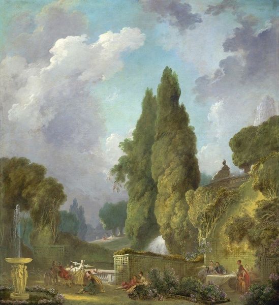 Hubert Robert painted this scene of a country villa with figures promenading near a cascade of water. Dominant lines direct our gaze into the distance, creating a sense of depth and perspective. The composition is structured by the stark verticality of the trees that frame the scene and the cascade of water in the center. The subtle coloring evokes a serene and picturesque atmosphere. Robert constructs a visual landscape that embodies the Enlightenment-era fascination with order, nature, and classical ideals. The formal arrangement reflects a semiotic system of power and control. Waterfalls are engineered, nature controlled and rationalized, the people are neatly placed within the setting to reinforce an ideology of progress. Yet, Robert also imbues the scene with a sense of idealized leisure. The linear perspective and compositional organization invite us to consider how landscape painting was employed not just to represent the world, but to actively shape perceptions of space and social order. Art like this presents nature as something to be viewed and appreciated by the cultured elite.