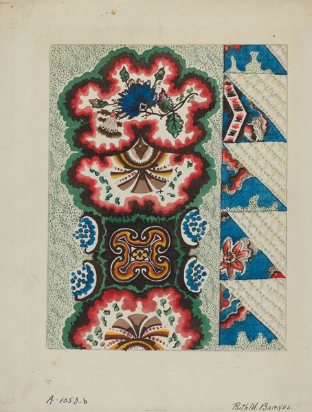 Editor: Here we have Francis Law Durand's "Quilt (Bed Coverlet)", made around 1936. It seems to be a drawing of a quilt design, primarily using coloured pencils. I’m immediately drawn to how decorative it is; the floral elements combined with the geometric background are quite striking. What are your initial observations of its formal qualities? Curator: Thank you. I appreciate that initial response. Focusing on form, consider the deliberate contrast Durand establishes. Note the juxtaposition of organic, curvilinear floral patterns against the rigid geometry of the quilt's grid and triangular border. It's a dialogue between naturalistic representation and abstract design. Editor: I see that. The way the floral designs seem to 'float' above the geometric patterns does create a tension. It almost seems to defy the flatness usually associated with quilts. Could you expand on that relationship? Curator: Precisely. Consider the colour palette: muted, pastel tones dominating the background, causing the more vibrant floral hues to stand out, accentuating their three-dimensionality. Durand uses colour and line to create depth where there realistically would be none. The coloured pencil application is key, the hatching and layering building up a textural richness. What purpose does the colour pencil bring to the composition in your view? Editor: I would say that the pencil adds some element of character by giving it a textured quality; it allows the drawing to seem soft to the viewer even though the viewer is separated from the piece by material. Is that accurate? Curator: It is, the texture is the key to contrasting themes between hard material versus comfort, even if visually expressed. I would also include the effect that texture makes to balance colour and structure between background and focal areas of the piece. In conclusion, the tension arising from Durand's meticulous orchestration of line, colour, and form, compels a re-evaluation of something we tend to take for granted --the familiar, homespun object that is the bed coverlet-- transforming the very object into a captivating work of art. Editor: That makes complete sense. It’s interesting to think about how an image can have such impact without needing any other context. Thanks for clarifying that!