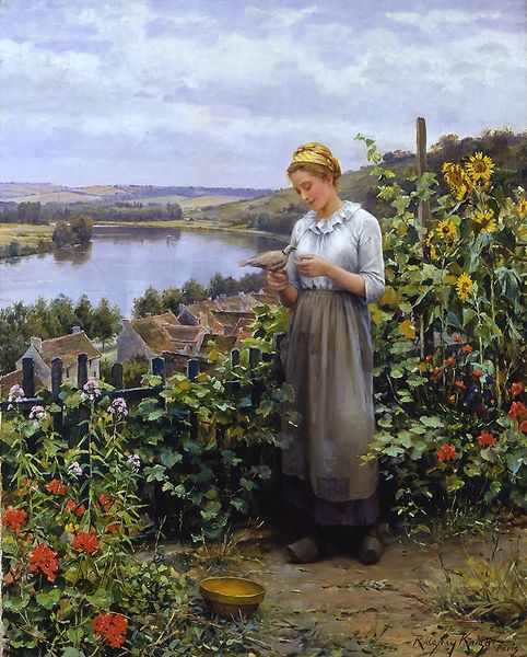 Curator: Let's explore "The Rose Garden", painted by Daniel Ridgway Knight. He captured this scene en plein air, using oil paints to bring the canvas to life. Editor: It strikes me as instantly tranquil, almost dreamlike. The figure and foliage dominate, and the overall effect relies on very soft and balanced structural cohesion, giving off a serene but contained presence. Curator: Note how Knight masterfully orchestrates color temperature—the cool lavenders in the distant sky contrast with the warm yellows of the garden. The eye is led on a subtle journey using tonal arrangement as a signifier of social context, juxtaposing rural beauty and romanticised labor. Editor: Indeed, the roses themselves—deep reds, creamy whites—are archetypal symbols of love, beauty, and often the fleeting nature of both. Their prominence surrounding this figure imbues her presence with those same notions. It’s interesting how these symbols interplay with that imposing parcel slung on her shoulder; those clippings intimate to some narrative beyond pastoral charm. Curator: Absolutely, and observing the structural contrast in the girl’s pose; note how her gaze drifts toward the distant lake while the weight on her shoulders physically grounds her. Knight is deliberate. The linear verticality of her dress plays with the wild arrangement of rose blossoms and their vine system. Editor: This adds a layer of psychological complexity. She’s caught between the demands of daily work and a longing for something more, the distance offering perhaps the space for those desires and longings to emerge; not unlike Eve with the fruit from Eden’s tree—only she seems more certain, poised, and self-aware. Curator: I’d agree there, there are a number of different approaches we can take when trying to unravel Knight’s symbolism, though the formal properties of the composition remain central to its enduring power. Editor: Yes, ultimately, these roses and the land at which the young maiden rests offer viewers a potent invitation into the complexities and inherent beauty that are a common undercurrent across humanity.