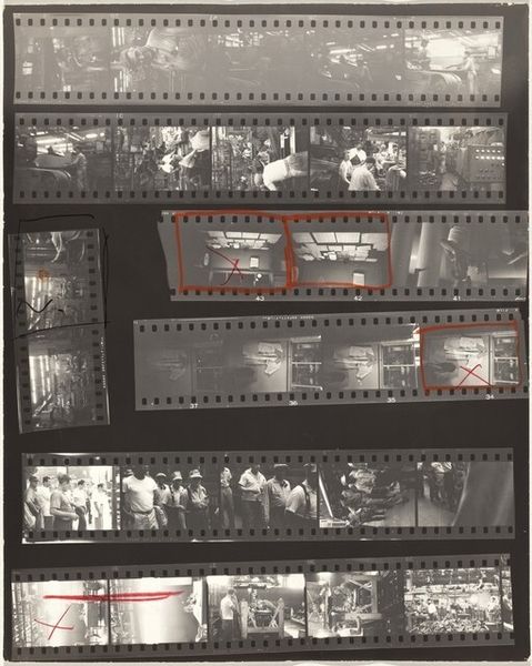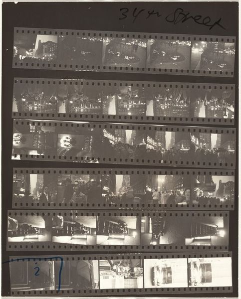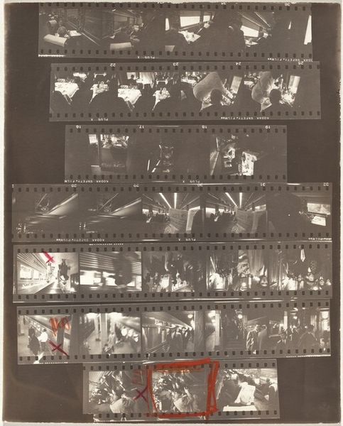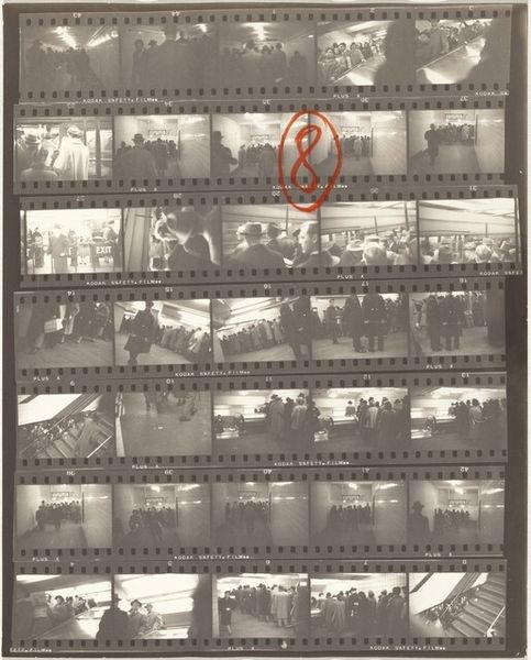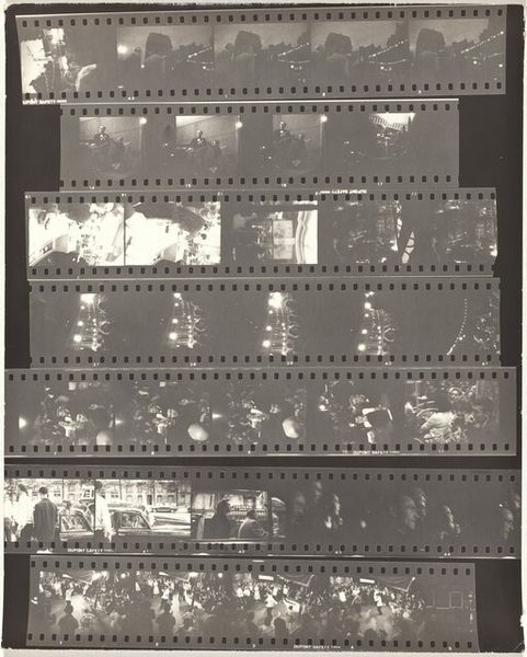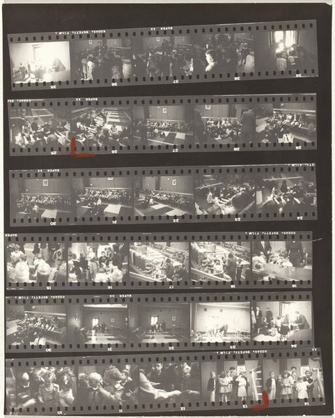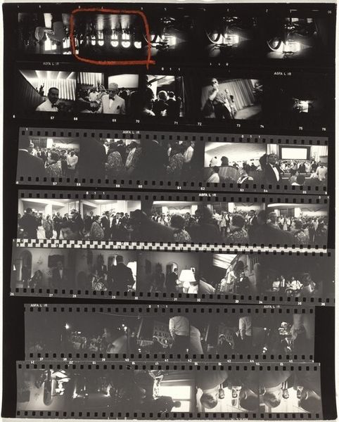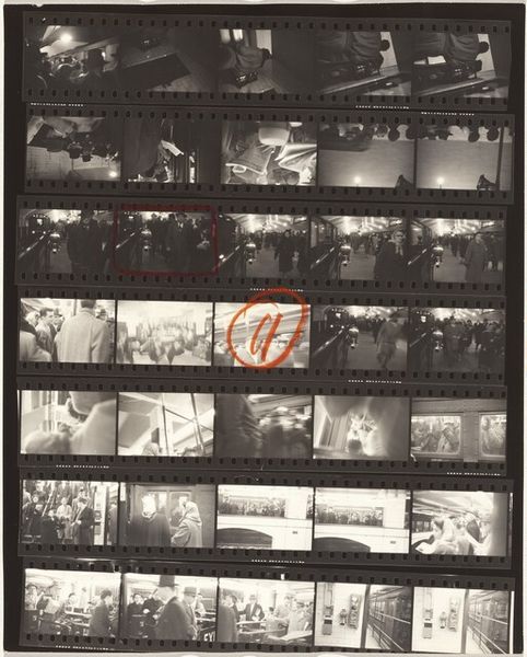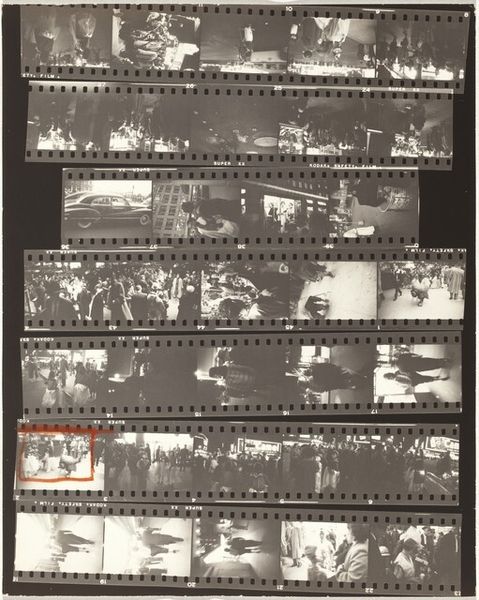 Curator: This is "Party and Moore vs. Marciano--Museum of Modern Art no number," a gelatin silver print by Robert Frank, created in 1955. Editor: It feels like looking through someone's memories – fragmented, a little hazy, but with this strong sense of immediacy. All those filmstrip frames create such an intriguing layered narrative, don't they? Curator: Absolutely, that’s what struck me first too. You can see a progression; it’s more than a simple snapshot, and far from one perfect shot. There’s a beginning, middle, and probably more we can imagine beyond the visible frames. Editor: You can practically smell the aftershave and hear the polite cocktail chatter in those crowded shots. What kind of statement do you think Frank was trying to make, contrasting high society with maybe something grittier, more ‘real’? I feel it simmering. Curator: Well, Robert Frank often portrayed everyday life with a kind of brutal honesty and irony, and this is definitely in that vein. Look how he juxtaposes the boxing match – Moore vs. Marciano, an event of raw, physical conflict – with what appears to be an upper-class social gathering at the MOMA. The high and the low, presented together…almost like they happened in the same breath. Editor: Right? The cultural elite and popular entertainment…two sides of the American dream. Is he challenging who gets to be remembered, or considered culturally valuable? Boxing might be as important to working-class America as modern art is to another segment of society. Curator: Maybe it's as simple as observing how people behave in very different contexts, searching for something uniquely human amidst the stark contrasts. The compression of those realities is very pointed, but also rather delicate in the execution. Editor: You can read this photo as a critical take on class disparity, about who holds power and influence…But there's something so universal in how he captures people simply being. Do you think this could just be Frank's attempt at finding beauty in the mundane, in these tiny, everyday interactions regardless of background? Curator: Probably a bit of both. His brilliance lay in finding the extraordinary hidden within the ordinary, using those stark juxtapositions to provoke, but also to evoke…empathy? Maybe not, maybe he leaves us questioning everything. I leave feeling almost seasick by his cultural contrasts. Editor: Sea legs required. It reminds us that the world, then and now, is composed of overlapping stories, constantly interacting, often clashing. A great artwork indeed, in its challenge of perspective.