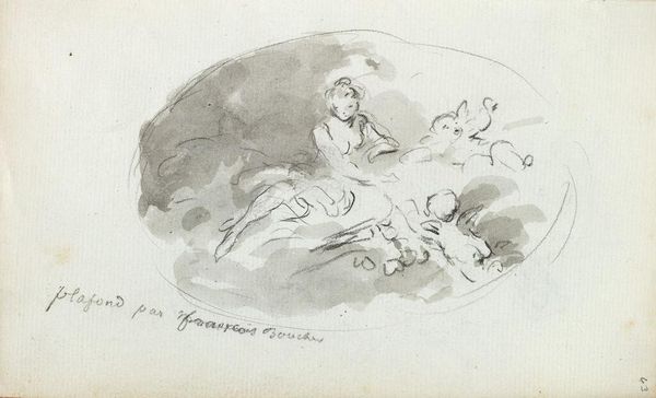 Editor: This is a sketchbook page by Gabriel Jacques de Saint-Aubin, located at the Harvard Art Museums. It shows a woman and a man reclining. What do you see in this drawing? Curator: I see a snapshot of 18th-century power dynamics. The woman is upright, adorned, while the man reclines, seemingly in supplication. Do you see how her posture, even in a sketch, asserts a certain dominance? Editor: That's interesting, I hadn't considered their postures in relation to power. Curator: Saint-Aubin was capturing a moment, perhaps a critique, of the rigid social structures. It's a silent commentary on gender and class. Editor: So, it's more than just a casual drawing? Curator: Exactly. It's a window into the complex social ballet of the time. I wonder what their relationship is? Editor: I'll definitely look at eighteenth-century art with new eyes now. Curator: And hopefully, question the power structures that continue to influence our own society.