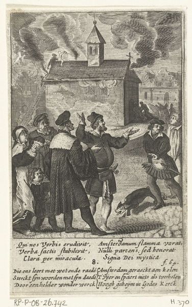 This print, titled *De kerk waar de hostie wordt bewaard brandt af maar de hostie blijft gespaard, 8*, meaning *The church where the host is kept burns down but the host remains unharmed, 8*, was made anonymously. It captures the dramatic scene of a church ablaze, an event laden with religious and social tension. The survival of the host, the sacred bread, amidst the destruction, symbolizes divine intervention. In a time of religious conflict, the artist uses this event to explore themes of faith, resilience, and the power of belief. The depiction of the figures, their gestures, and their expressions, conveys a mix of awe, fear, and reverence. The contrast between the chaos of the fire and the calm demeanor of some onlookers suggests a deeper meditation on faith and the enduring strength of religious conviction. The unscathed host becomes a beacon of hope and a sign of divine favor. This image invites us to consider the intersection of faith and social upheaval, reminding us of the emotional and spiritual power of symbols in times of crisis.