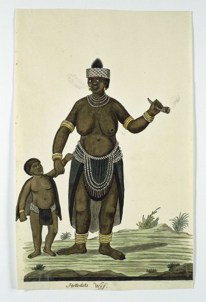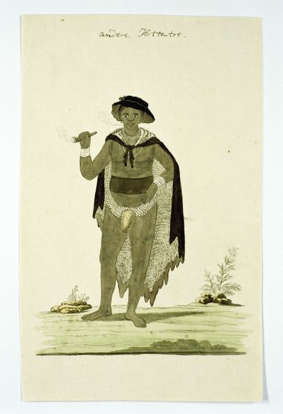 Editor: So, this is Robert Jacob Gordon’s "Standing Khoikhoi woman," likely created between 1777 and 1786, using ink and watercolor. I’m immediately drawn to the detailed rendering of her clothing and adornments. How do you approach this image? Curator: I'm fascinated by the materiality of the depiction itself. Think about the pigments used for the watercolor, likely sourced through colonial trade routes. The ink, too, tells a story about access to resources. Consider how these materials were employed by Gordon, a European military officer and explorer, to portray an Indigenous woman. What labor went into the *making* of this image, and what does that say about the social hierarchy it represents? Editor: That’s interesting! I hadn't considered the implications of the materials themselves. Is the detailed depiction of her garments then a reflection of their value or status within her community? Curator: Possibly, but let’s also examine this detail critically. Who benefits from this detailed recording? Does it serve a scientific or anthropological purpose for the colonizers, or does it genuinely reflect an appreciation for the woman's culture? Perhaps both. We should also think about how the creation and subsequent consumption of this image contribute to a system of power imbalances. What do you make of the composition overall, and how it affects how we perceive the subject? Editor: Now I see how closely it is related to questions of value and exchange. Thank you for revealing so many nuances! Curator: Of course. Hopefully it inspires a greater appreciation for both the aesthetic qualities of the work and the processes and historical contexts behind its creation.