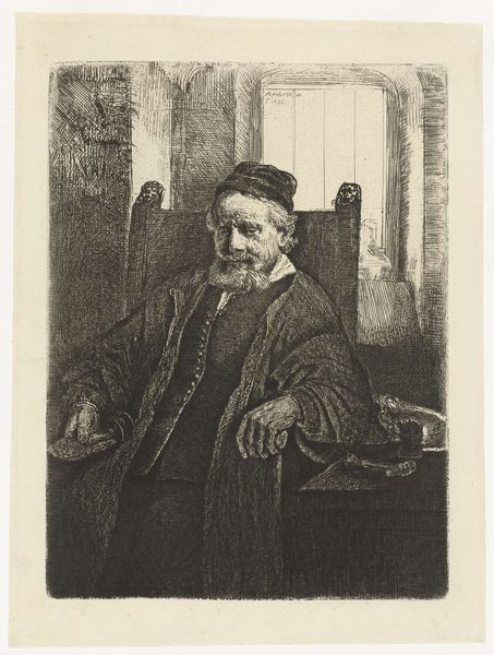 Joan Berg created this self-portrait print using etching techniques. The visual field is dominated by a tonal range that fluctuates between light and dark, with a somber palette that may evoke a feeling of introspection. The composition is structured around a contrast between the detailed rendering of Berg's face and the more loosely defined background. The artist's gaze is averted, suggesting a sense of detachment. Note how the etched lines create texture and volume, particularly in the drapery of the clothing. The background is made up of a dense network of hatched lines, creating an almost palpable sense of depth. It seems that Berg is not merely representing a likeness but also exploring the psychological dimensions of portraiture. The use of etching allows for a degree of ambiguity and openness, inviting us to contemplate the relationship between representation and self-understanding. The formal qualities of the artwork function aesthetically and as part of a broader discourse on the self.