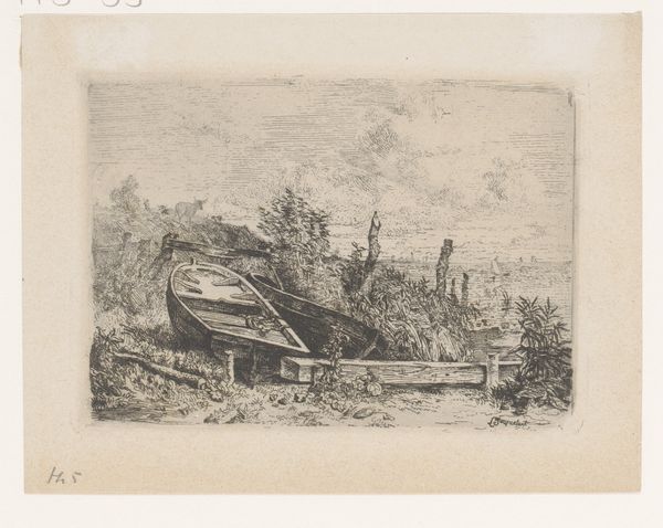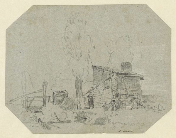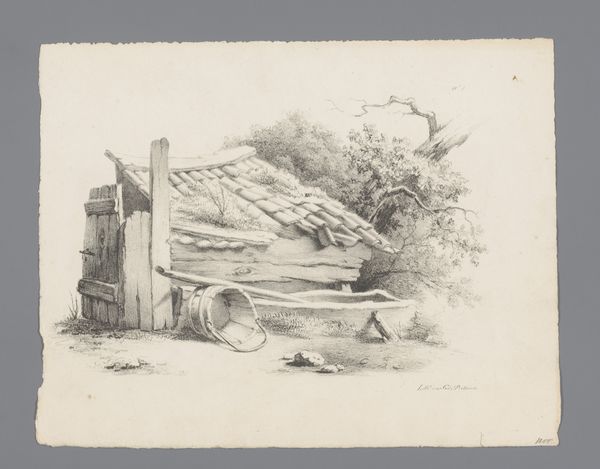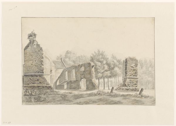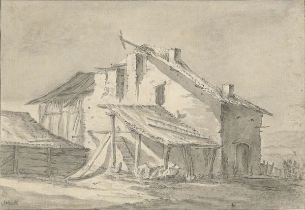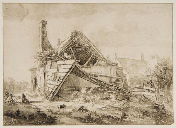 Cornelis Brouwer created this drawing, Vervallen boerderij, with pen and gray ink, and brush in gray, sometime in the late 18th century. The drawing’s material qualities—the delicate lines and tonal washes of the pen and brush—lend themselves beautifully to the subject: a dilapidated farmhouse. Brouwer captures the scene with sensitivity, emphasizing the textures of decaying wood and crumbling thatch. You can almost feel the weight of the collapsed roof. The drawing is not just about the house itself, but also the circumstances that led to its state of disrepair. We can imagine the labor involved in constructing the building, and the lives of those who once inhabited it. The fact that Brouwer chose to depict the farmhouse in ruins suggests a commentary on the economic and social forces that were transforming the Dutch countryside at the time. By focusing on the material and social context of this drawing, we can appreciate it not just as a beautiful work of art, but also as a poignant reflection on the human condition. It challenges the traditional art history by looking at the wider context of labor and social commentary.