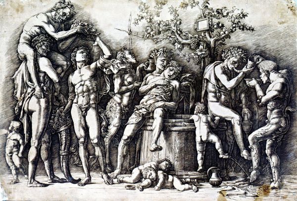 Editor: So, here we have Andrea Mantegna's "Bacchanal in Silene," an engraving from around 1480. It's quite chaotic! All these figures intertwined, almost like a visual overload. What's your take on this? Curator: From a materialist perspective, this print speaks volumes about the shift in artistic production during the Renaissance. The very act of engraving – the labour, the tools used, the deliberate, reproducible marks on the plate – allowed for wider dissemination of classical themes, which were previously confined to unique paintings commissioned by the elite. Editor: Interesting! So the medium itself democratized the imagery? Curator: Precisely! Consider the subject: a bacchanal, a scene of unrestrained revelry associated with Bacchus, the Roman god of wine. This wasn’t simply about illustrating a myth. Mantegna’s choice of engraving as a medium made this vision of ecstasy available to a growing middle class, sparking dialogues about consumption, pleasure, and social order. Editor: It's a really sharp image... I imagine it takes precision to render a composition like that! Was it common to recreate artworks through printmaking at the time? Curator: Think about the access to artistic production it provides. Here we have ancient mythology being translated through labor intensive methods to mass produce 'high art' for larger groups of consumers. Do you think this challenges notions about art? Editor: I think that it does challenge my understanding of it. The creation is inherently bound to class, which makes the act of mechanically reproducing this classical subject interesting because it becomes almost subversive! Curator: Exactly. We often forget to examine the economic structures that underpinned the Renaissance. The circulation of prints like this one highlights how art served not only aesthetic but also commercial and social functions, transforming it from a unique commodity to a widely accessible medium of cultural exchange.