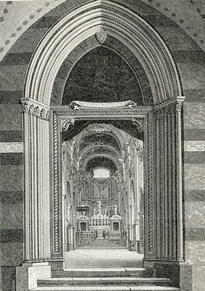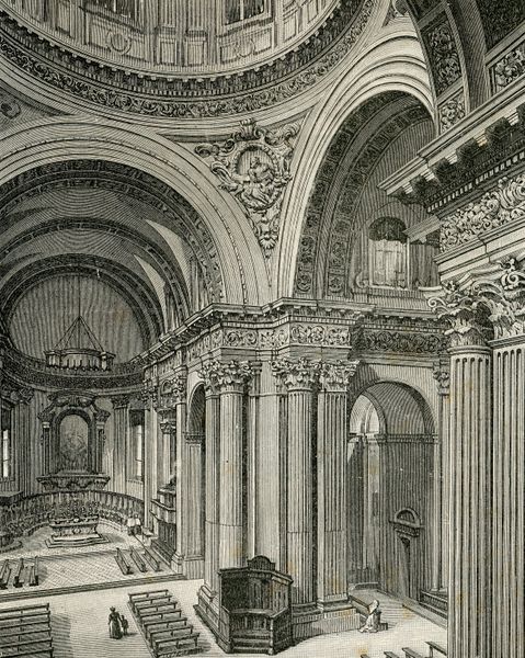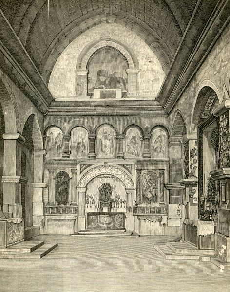 Curator: Today we’re looking at "Interno Del Santuario," an engraving by Giuseppe Barberis, created around 1897. What strikes you most when you first look at this piece? Editor: The sheer volume, the use of visual space… it feels incredibly formal, almost oppressive in its meticulous detail. There's something about these cavernous interiors, devoid of human presence in the artwork itself, that speaks volumes about institutional power, don't you think? Curator: The technique employed—the intricate linework—undeniably constructs that sense of imposing grandeur. The use of perspective directs the eye inexorably towards the altar. What compositional strategies do you notice? Editor: And that altar – positioned at the very end of that very long hall, which might signal that accessibility is withheld from those who don't hold privilege or authority within the church. Look at the details within the confessional boxes and their architectural design! It presents itself as a place to seek forgiveness. Is redemption equally accessible to all, or does it reinforce power structures? Curator: A very interesting interpretation. Let's look at it formally. The light, despite being a black and white engraving, seems diffused yet precise, highlighting key architectural elements while shrouding others in shadow. This creates depth but also reinforces the structure's geometric purity. Editor: Geometric purity serving power. I see so much being left unsaid here. A place like this—a place of religious worship—inevitably means different things to different people across race, gender, and class. Who is it really *for*? And what does it exclude? Curator: It also reminds me of Piranesi’s etchings of prisons—vast architectural spaces. The graphic work accentuates verticality, reinforcing ideas of ascension, of heaven. Editor: That's true; visually it certainly implies transcendence. But these spaces are firmly *here*, materially constructed with earthly power and earthly money. What human stories aren’t we seeing reflected in the arches and ornamentation? I want to consider what's missing, what is marginalized. Curator: Barberis, in capturing this moment, leaves us with both an extraordinary aesthetic achievement and a profound reflection of a constructed hierarchy. Editor: It seems the artwork does provoke conversation—about architectural rendering, representational accuracy, the relationship between power and form, the stories that we tell ourselves about religious spaces. Thank you!