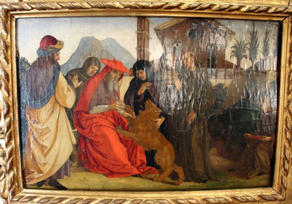 Editor: This is Giotto’s "St. Francis Giving his Mantle to a Poor Man," a fresco from around 1299, found in the Basilica of Saint Francis of Assisi. It’s striking how grounded the figures feel, even with that somewhat ethereal landscape behind them. What compositional elements stand out to you? Curator: The geometric arrangement immediately captures the eye. Consider the two figures; their interaction is framed by a delicate equilibrium of forms, note the echoing diagonals of the hillside behind them and how the lines guide our gaze towards the focal point, which is their shared mantle. The painting seems to prioritize structure. Editor: I see that now! It almost feels like the landscape is designed to highlight their exchange, or mirror the emotion somehow. How does Giotto's use of color play into this arrangement? Curator: Note the restrained palette and deliberate deployment of hues. Observe how Giotto’s modeling suggests the presence of light and volume without overwhelming the visual field, contributing to the geometric cohesion. Notice the tension between the more muted, earthy tones of the natural world and the slightly more saturated clothing of the figures. Editor: It's all about the relationships between the forms, not just the story being told. Curator: Precisely. And consider how Giotto is already pushing towards a more naturalistic depiction, a move away from strictly symbolic representation of the period. Even in this act of charity, we are invited to consider the pictorial architecture first. Editor: I see so much more than just a saintly act now; I see a carefully constructed visual world. Curator: Exactly! It is a balance, and by observing these balances you will discover how artists convey meaning using structural elements to support their message.