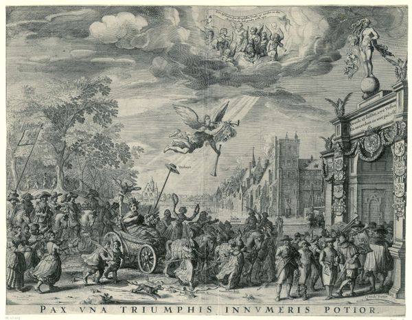 Curator: What a scene! It feels utterly chaotic, but compelling. Editor: It certainly does. We're looking at Stefano della Bella's "Fifth scene, the Inferno, from 'The marriage of the gods' (Le nozze degli Dei)," created around 1637. This print, employing engraving and etching techniques, vividly captures a vision of hell. Curator: Etching and engraving, the perfect mediums to illustrate this frenetic scene. Note how the lines create so much texture, especially in the smoke and flames. What was the production of this print dependent upon? It seems almost mass produced with all of this fine detail. Editor: It was, in many ways, meant for wider consumption. Consider the period and the popular appetite for allegorical and historical imagery, prints like these disseminated visual narratives but also power. Curator: Power in spectacle and control of the means to illustrate divine will. This theatrical composition has several focal points; from a God chariot in the sky to a hellish procession below with a swarm of flying figures around it. But it's also set among architecture. This feels deliberate. Editor: Yes, these architectural structures reflect stage design common in Baroque-era theatrical productions. Della Bella worked in the Medici court. This print would've had appeal as both a representation of power and a luxury product on its own terms. These classical facades and monuments serve to show earthly power under assault in a biblical inferno. Curator: The combination of refined printmaking techniques and theatrical design clearly offered powerful social and political statements. A tangible display, carefully conceived for maximum impact. But what lingers with me is this meticulous labor needed to create a work about infernal chaos! Editor: Absolutely. Looking at Della Bella’s work reminds me about how the historical conditions of production influence what messages were sent to an increasingly larger public sphere. The role of images, in political and religious contexts, can not be understated during the Baroque era. Curator: I agree; understanding both the technical process and broader cultural forces certainly enriches the experience of the artwork for me. Editor: Indeed. I think contemplating on these prints helps us think about how institutions and social forces shape even seemingly fantastical artwork like this.