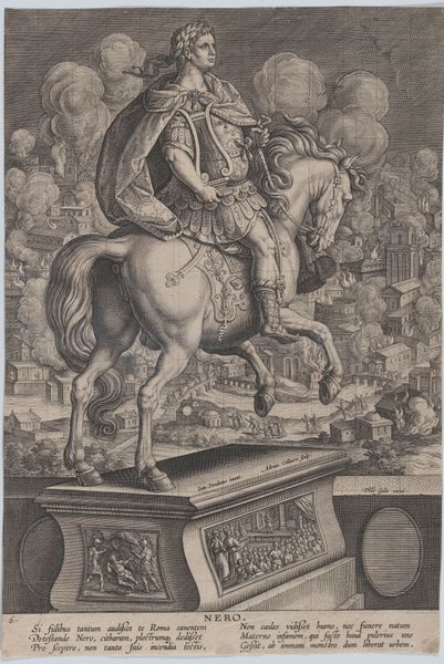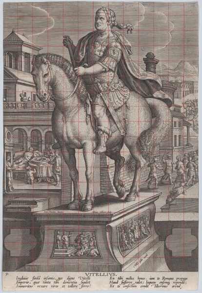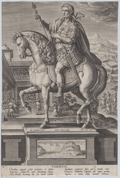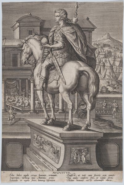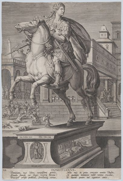 Editor: This engraving, "Plate 8: equestrian statue of Otho," created between 1582 and 1594 by Adriaen Collaert, depicts a statue with a background of violence. The contrast is striking. What do you see in this piece, especially given its complex composition? Curator: Indeed. Focusing purely on the formal aspects, observe how Collaert manipulates perspective. The statue is presented frontally, commanding our attention, while the background recedes, offering a narrative context that diminishes in visual prominence. Note also the lines of the engraving, creating textures that define form and delineate the scenes of violence from the stoic image of Otho. Editor: The lines are interesting. So you're saying the engraving technique itself guides our understanding? The hatching, for instance, builds up a sense of depth in the statue's drapery and then contrasts against the open background? Curator: Precisely. Collaert directs our eye, structuring our interpretation of the statue against the narrative backdrop. Moreover, consider the materiality; the rigid metal from which it is created contrasts against the human actions portrayed. In light of its materiality, would you agree this contributes to the stoic mood you perceived earlier? Editor: Absolutely, the solidity and detail of the statue definitely contrast with the more chaotic and sketchier depiction of the scene behind it, almost as though they are disconnected from each other despite appearing in the same plane. I never thought to separate the different elements this way before. Curator: By isolating and analyzing these formal components—perspective, texture, materiality—we move beyond the subject matter to decode the structural logic underpinning Collaert's representation. Editor: That's fascinating! I'll certainly be looking at engravings with a new eye from now on!