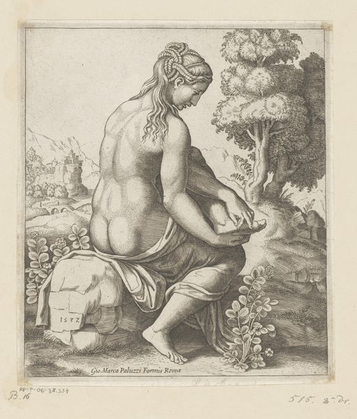 Curator: What strikes me immediately is the delicate nature of this work; it seems fragile, almost as if it could fade away if exposed to too much light. Editor: Indeed, it does possess an ephemeral quality. This drawing, titled "Knielende vrouw naast plant" or "Kneeling Woman Beside a Plant" resides here at the Rijksmuseum and was created sometime between 1688 and 1698 by an anonymous artist. Executed in watercolor, it presents a figure in quiet contemplation. Curator: Contemplation or perhaps supplication? Her clasped hands and upturned gaze suggest a plea, but to whom, and for what, remains unsaid. The fact that it is genre-painting and a portrait raises the stakes on understanding the identity politics and the cultural expectations put on women in the late 17th century. Is the plant some kind of signal too? Is she asking forgiveness? Or, is she simply trapped in a society that requires this type of subjugation to a God or maybe, to an oppressive male figure? Editor: It’s tempting to ascribe such loaded symbolism. It could also be the depiction of a scene of daily devotion, fitting with a social emphasis on piety and religious observance at the time. Look at the woman’s garments. That is, considering socio-political history is to see here an emerging bourgeoisie seeking connection to symbolic imagery with women and gardens... The necklace, for instance. Or even that she wears a fancy hairstyle! But if one really wanted to understand its public role we’d need to dive deep into Dutch cultural nuances of the era to know better how devotional themes were circulated. Curator: But doesn't that just normalize existing oppressive social roles? Looking beyond devotional representation of femininity to think critically is crucial to consider this artwork now in terms of broader intersectional narratives that challenge, instead of reproducing gendered and social power dynamics. Editor: I see your point. Without solid context to determine what this scene meant at the time, projecting current perspectives does create risk. However, those projected ideas are still worthwhile conversations, given their influence on understanding ourselves today in relation to art’s enduring social function through history. Curator: Perhaps the lasting value then resides precisely in that ambiguity, that openness to varied readings over time which encourage the interrogation of how images operate, past and present. Editor: Precisely, and our dialogue reflects art history’s dynamism, doesn’t it? Whether it affirms social constructs or motivates change, it can continue teaching us!