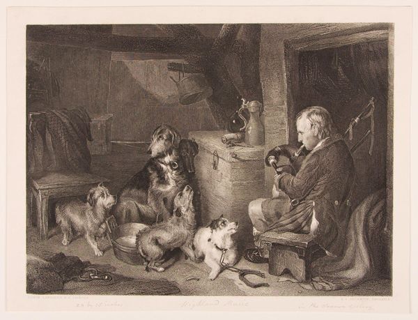 Petrus Marius Molijn made this etching, "Old Man Reading to His Wife", in the 1840s. Molijn died young, at only 29, in a cholera epidemic. The scene depicts an interior in which an elderly man sits and reads to his wife, who lies in bed. This quiet, intimate moment speaks to the cultural values of 19th-century Dutch society, emphasizing domesticity and the importance of familial relationships. The setting is humble, yet the act of reading brings a sense of warmth and connection to the space. The man’s literacy and engagement in reading aloud suggests a degree of education and social awareness that might have been aspirational for some viewers. The work invites reflection on the emotional and personal aspects of daily life. It’s a poignant reminder of the simple pleasures of companionship and the comfort found in shared moments.