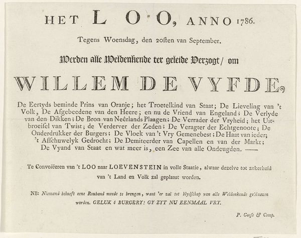 Editor: This print, titled "Vers op de zes vrijdagse gebeurtenissen rond prins Willem IV, 1711-1752," was created anonymously in 1752. It looks like an engraving on textile. It seems to commemorate the life of Prince Willem IV, but what strikes me is the repetitive emphasis on "Friday" and wondering about its importance. How do you interpret this work? Curator: The relentless repetition of “Friday” serves as a key to understanding this memorial print. Consider the cultural memory associated with Friday—a day linked to both good fortune and religious solemnity across various traditions. What do you think could be the emotional effect of this association with Prince William? Editor: Well, it seems deliberate, almost like imprinting this prince’s life with a sense of divine ordination and perhaps bittersweet fate? The list feels structured. Curator: Precisely. Each listed Friday event -- his birth, marriage, appointment, the birth of his son, his death, and burial -- marks a significant transition in his life and rule, a visual structure. Do you think there is an implied narrative? Editor: I suppose that, even without knowing Dutch, one can see the beginning and ending as hopeful and mournful at once. To have birth and death connected in such a way makes you consider larger ideas of legacy. Curator: The artist is building Prince William’s narrative by framing all of life’s key moments in the singular symbolism of this repeated, commemorative "Friday." What we see here is the deliberate creation of a ruler’s legacy steeped in the complex cultural significance of a single day of the week, using an appeal to both the intellect and emotions. Editor: That's fascinating! I didn’t realize how much cultural weight a simple day could carry. Thanks for pointing out how these repeated visual and verbal cues can create a powerful, lasting narrative.