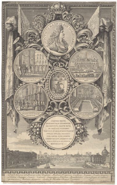 Editor: This artwork, titled "Portretten van Barnabé Brisson en Johann Gottlieb Heineccius," dates back to 1743. It is the work of Johann Christoph Sysang and the piece utilizes drawing, print, engraving, ink, and paper. Looking at this work, I find the contrast between the portraits and the books quite fascinating. What draws your eye to it? Curator: The engraving presents a hierarchy achieved through careful formal arrangements. Note the symmetrical framing: portraits enclosed in ovals are enthroned atop an architectural scene. The cherubic figures act as brackets, literally and figuratively supporting the portraits and lending a sense of elevation. Editor: It almost feels like two distinct compositions merged into one. Why this emphasis on structure and composition, and how does the Baroque style enhance that? Curator: Baroque aesthetics typically favor ornamentation and a sense of movement, yet here we see the detail largely confined to the frame around the portraits and the textures of the library. Ask yourself, what does that tension between control and exuberance do for the reading of the work? Editor: The ornate framework contrasted with the relatively sparse depiction of the lower portion does create a noticeable push and pull for the eye, almost a competition between knowledge and personality. Curator: Precisely. The artist has created an interesting dichotomy. Editor: I hadn't considered the deliberate structuring that creates those competing elements, really interesting, thanks! Curator: My pleasure; structure dictates function, always.