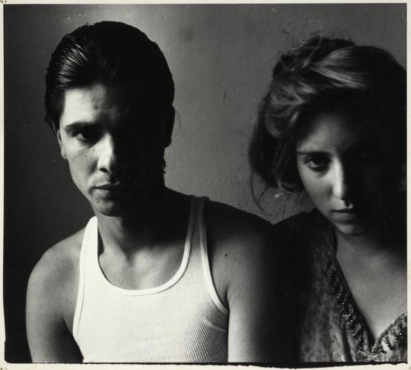 Editor: So, this gelatin-silver print, "Mary and Dan Solomon" by Arnold Newman, dates from 1989. I'm struck by the formality and the considered composition, even down to the textural differences between their outfits. What aspects draw your eye, considering how Newman might have conceived of the final product? Curator: Given Newman's position within photographic portraiture, and my focus on material production, I consider this work through the lens of labour. The gelatin-silver print process itself involves a complex choreography of labor, from the manufacturing of the materials to the photographer's craft and darkroom techniques. This couple's portrait, presented in high-contrast monochrome, uses the very trappings of corporate presentation – suits, formal poses - to subtly challenge what we assume to be a clear, unbiased representation of success. Do you think the material and method serve to celebrate or perhaps subtly critique their social standing? Editor: That's a perspective I hadn't fully considered. Perhaps the choice of gelatin-silver, with its inherent archival qualities, implies a desire for permanence and reinforces the power structure, even if there is room to interpret this as subtle criticism. Does the backdrop itself have meaning or significance for you? Curator: Absolutely. It appears constructed, almost like a minimalist stage set. The use of contrasting tones isolates the Solomons, directing focus towards them and underscoring the deliberate fabrication of the image. The manipulation of light, the carefully chosen clothing, even the couple’s arrangement, all point towards Newman’s labour as an artist. The act of image construction emphasizes wealth and position and invites scrutiny of how these ideas were produced. Editor: I appreciate how you've highlighted the materiality and labor interwoven into what initially appeared to be a straightforward portrait. I’ll never look at this photo in quite the same way. Curator: And I found your thoughts about permanence in the process, pointing to power structures, very useful and perceptive.