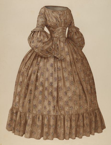 Julie C. Brush created this work, titled "House Dress", with watercolor. The dress is a striking image, with its puffed sleeves and full skirt suggesting volume and a certain kind of domesticity. The repeated floral pattern across the fabric presents a complex structure, a semiotic system of signs that invite interpretation. The dress, rendered in soft watercolors, appears both substantial and ephemeral. The choice of medium softens the otherwise rigid formality of the dress's shape. The dress hangs devoid of a figure, which questions traditional portraiture and representation. The artwork destabilizes established meanings by presenting the dress as an object of contemplation rather than a garment to be worn. It becomes a focal point for broader artistic and philosophical concerns. It invites us to consider how clothing, as a cultural artifact, carries layers of meaning.
