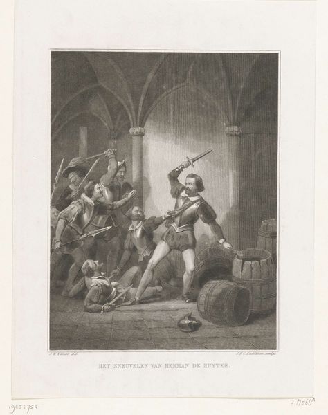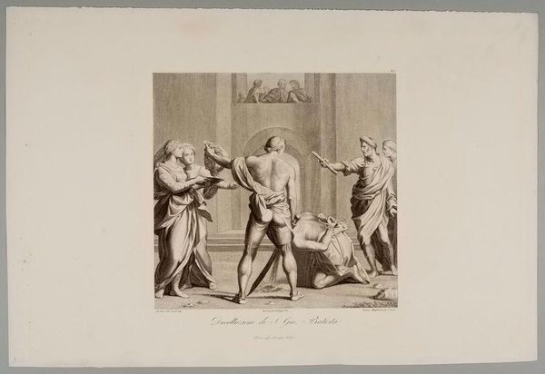 Curator: Here we have Jean François Ribault’s, "The Crowning with Thorns." Ribault was a French artist who lived from 1767 to 1820. Editor: It’s oppressive. All that dark ink, pressing in on Christ. Like the weight of the world is crushing him. Curator: The piece is a study in the abuse of power, isn't it? The jeering soldiers and the impassive bust overlooking the scene. Editor: Absolutely. That bust feels like the cold indifference of institutions. Makes you wonder, who are we really serving with such displays of cruelty? Curator: Indeed. I think the art challenges us to look beyond the immediate scene, and reflect on those power structures. Editor: It’s a bleak reflection, to be sure. But necessary, I suppose.