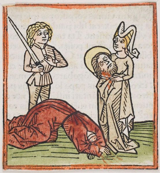 Editor: This is Illustration VI, by an anonymous artist. The figures and bright colors have a medieval quality. What strikes you about this image? Curator: I'm immediately drawn to the social dynamics at play. Who benefits from this labor, and who is excluded? The figures with halos watch as another toils, possibly challenging medieval notions of labor. Editor: So, it is a visual representation of hierarchies? Curator: Yes, and we must consider that the illustration is likely linked to religious parables, which also encode social expectations and gender roles. What does the harvest symbolize to you? Editor: I see it as a representation of resources. This really challenges how I initially perceived the illustration. Curator: Exactly. It shows how art can both reflect and critique the power structures of its time.