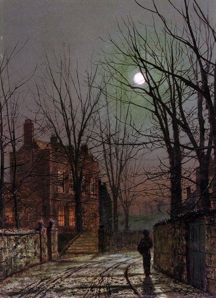 John Atkinson Grimshaw created "Lea Hurst, Kent" with oil on canvas, a very traditional fine art process. Grimshaw's nocturnes were built up with thin, translucent layers of paint. The artist used glazes, which are thin, oily, transparent layers of paint applied over a dried opaque underlayer. The way in which he applied the glazes, with exquisite, calculated detail, reflects an intense labor unseen in the work's final appearance. The details, from the wet cobblestones reflecting moonlight to the bare, slender branches of the trees, are highly observed. Grimshaw often catered to the tastes of industrialized Northern England. This contrasted with his Pre-Raphaelite contemporaries who were more interested in the aesthetic value of craftsmanship. While it uses traditional methods, this is art produced by a new kind of patron and a new kind of marketplace. It reflects a shift from the Arts and Crafts movement, rooted in the social critique of labor, to a celebration of the fruits of manufacture. Ultimately, understanding the social context of this artwork is vital to appreciating its significance.