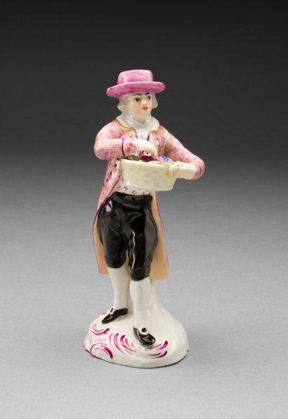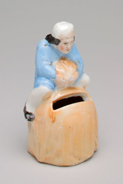 Curator: Let’s turn our attention now to this charming miniature: a porcelain figurine titled "Seal," crafted at the Chelsea Factory, probably between 1750 and 1770. Editor: Well, it's utterly whimsical! All those soft pastel colours make it almost seem like it's made of candy, though I bet that surface is rock hard porcelain. The scene seems lifted straight out of some playful dream. Curator: Indeed, the Rococo style certainly lends it that playful air. What strikes me, though, is how this piece demonstrates the industrial capabilities that underpinned the era’s aesthetics. Porcelain, this luxurious material, meticulously crafted and refined through complex processes. How do we reconcile that with this effervescent character it presents? Editor: That’s interesting. It makes me wonder who owned it and what purpose it actually had, you know? Perhaps it was set atop a box. This cute bagpipe player might've served to protect personal correspondence! I can almost imagine perfumed letters and little gossip tucked away in it. Curator: Yes! We see the opulence of the gold trim along the bottom there! Think about all the social exchange between England and France around that time—how that drove tastes and manufacturing techniques at places like the Chelsea Factory. They were basically racing to catch up to the mastery from the East and that would spread through France.. Editor: Looking at it now, I see that it really epitomises a yearning for pastoral simplicity…even as that simplicity was being commodified! Though now the piece lives within a glass case, silent. What do you take away from that? Curator: Hmm… it leaves me pondering the fragility of fleeting moments, perfectly preserved in fired clay, doesn’t it? Editor: Beautifully put. It feels as though it’s a captured breath from another time.
