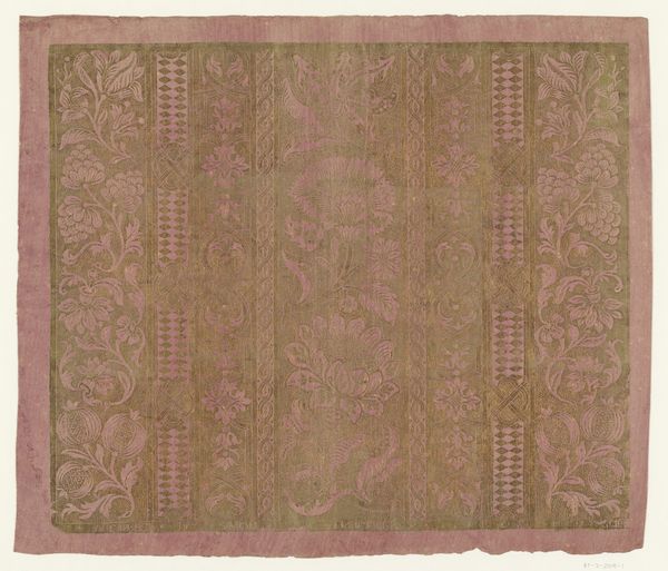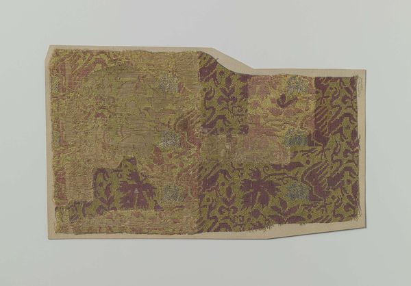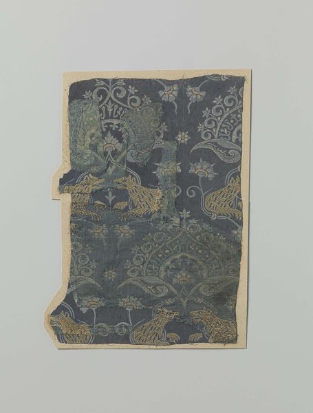 Curator: Here we have "Fragment zijdesatijn", an anonymous piece of silk textile that dates anywhere between 1100 and 1900. The fragment is patterned with what seems like a repeating floral or foliate design. What are your initial thoughts? Editor: It whispers, doesn’t it? Of faded grandeur. It’s that muted indigo that gets me – so much story in a scrap. Like a piece of a forgotten emperor's robe. Curator: Precisely. Textiles such as this played a significant role across societies, from clothing to furnishing, and even as currency. Their patterns often encoded status, origin, and religious beliefs. The museum’s collecting of fragments reminds us of the art market’s selective history. Editor: You know, it's funny how a tear can be so evocative. This gash here feels like violence… time just ripping through beauty. Curator: Indeed, the visible damage is fascinating in the study of the artifact itself. Its deterioration speaks volumes, raising important questions about how these items are valued, preserved, and displayed over time. Its conservation is key in this matter. Editor: I imagine hands upon hands touching this silk; feels like so much is held within it. Do you think we ever really "own" these old things, or do we just borrow them from the past? Curator: An astute observation. Perhaps custodianship is more accurate. We study these remnants to piece together a narrative that might challenge prevailing understandings of art history, power, and value, resisting that history is the purview of a chosen few. Editor: I guess I saw an ancient dream, and you see a silent battle. Which is maybe what art’s supposed to do, right? Reflect what we bring to it. Curator: Indeed, sparking that connection between the viewer and object—that’s often the most profound function we serve. We present it, you feel it, and from there, history lives on.