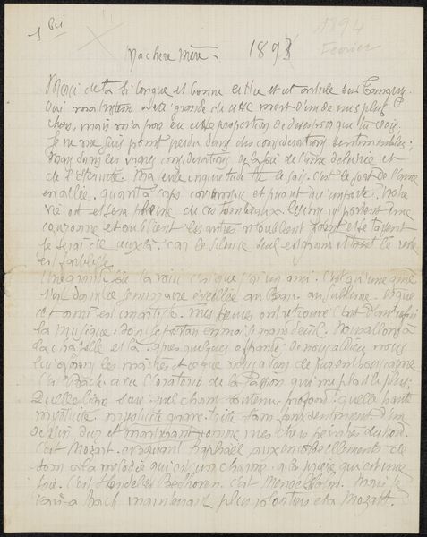 Editor: Emile Bernard's "Brief aan Héloïse Bernard-Bodin," created sometime between 1878 and 1941. It's ink on paper. The handwriting gives it an intimate feel, like reading someone's personal thoughts. What kind of cultural context might unlock further meaning in this piece? Curator: This letter-as-artwork functions almost as a relic, doesn’t it? We see the convergence of personal expression and broader cultural symbolism. Bernard's script, while individual, inevitably echoes the calligraphic traditions influencing the era. Do you see how the looping strokes and deliberate forms suggest a mind grappling with concepts beyond the literal words? Editor: Yes, there's a flow, but it is definitely dense. How so? Curator: Think about the late 19th century. There's a rising fascination with spirituality, a hunger for meaning beyond the purely material. Letter-writing was more than correspondence; it was a mode of self-exploration. The act of meticulously crafting each word becomes imbued with intention. Editor: Almost like a meditative act, with a tangible outcome. Curator: Precisely! Now consider that the content speaks to mysticism in both the Orient and Occident. This era saw Western artists looking to Eastern traditions for inspiration, often imbuing their work with exotic and esoteric themes. It begs the question: Is Bernard genuinely exploring spiritual insights, or engaging with a romanticized version of the “mystic East?” What do you see here? Is it discovery or romantic appropriation? Editor: That tension between genuine exploration and romanticism is really interesting to consider, given the artwork's title and date. Thank you! Curator: A visual whisper from the past. Analyzing these cultural echoes helps us decipher these unique aesthetic voices and visions, revealing unexpected narratives of who we are.