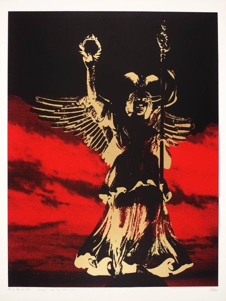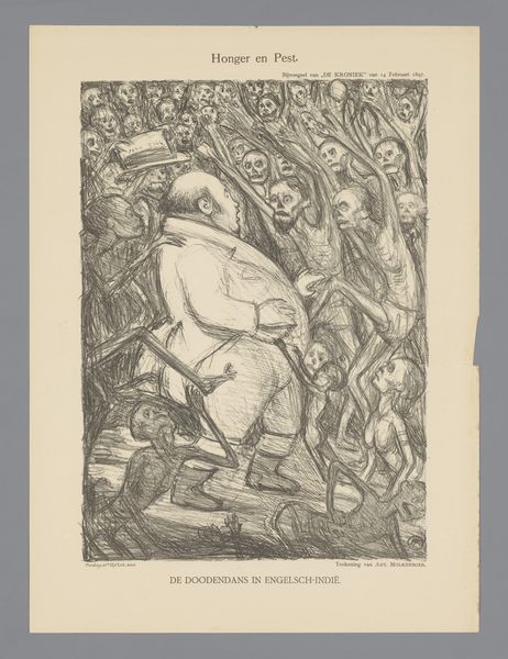 Editor: This arresting poster, “Affiche tegen militarisme uitgegeven door het Nationale Arbeiders Secretariaat in Nederland,” created sometime between 1918 and 1925 by Elias Smalhout, employs bold graphics and stark imagery. I’m struck by the nightmarish figures and how they represent militarism. How should we interpret this potent anti-war statement through the lens of its time? Curator: Indeed. We should consider the socio-political context. This poster emerged in the wake of World War I, a conflict that shattered previous notions of progress and exposed the brutal realities of industrial warfare. Given the Dutch National Labour Secretariat's backing, how does the artwork reflect the broader socialist critique of militarism as a tool of capitalist oppression? Editor: I see the armored figures representing war. The skeleton on the flag is terrifying, too, so I guess that that answers my previous questions. Curator: Precisely. Symbolism plays a crucial role here. Note the caricature of authority figures juxtaposed with the idealized worker. The "compulsory physical exercise" mentioned translates to militaristic indoctrination. To what extent does this poster capture a sense of widespread disillusionment and anxieties about the future of Europe in the interwar period? Editor: I hadn't thought of the physical exercise as a criticism of militaristic indoctrination. That helps unlock the meaning of the whole poster! Thank you for clarifying its symbolism. Curator: These kinds of pieces invite us to consider the public role of art in shaping political consciousness and mobilizing social movements during times of conflict and social change. Editor: Absolutely. It’s amazing how deeply historical context can influence our interpretation of even the most seemingly straightforward images. Curator: I agree, reflecting on this work shows the potency of visual language as a form of historical resistance.