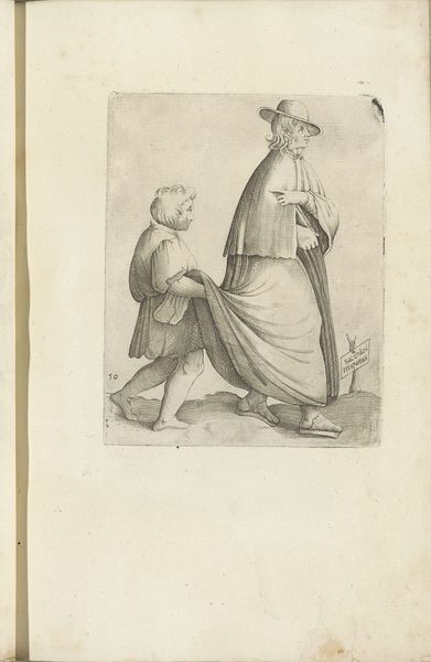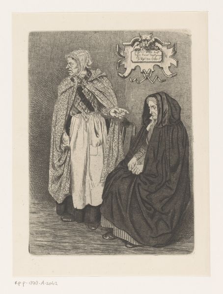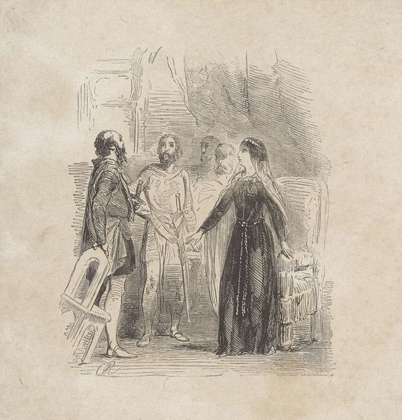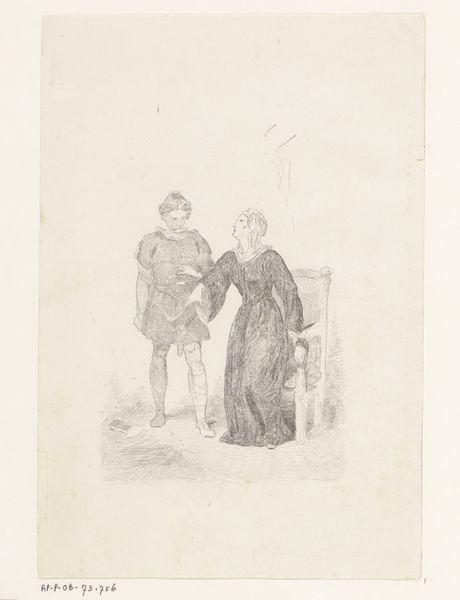 Curator: Looking at this image, I am immediately struck by the stark contrasts of light and shadow—a stage set for an intimate encounter. Editor: Indeed. What we’re viewing is the title page to W.J. Hofdijk’s "Helene," dating back to 1854. The artwork is credited to the Gebroeders Kraay, and the delicate marks we observe were created with a combination of pen and engraving. Curator: The clothing choices here are interesting. They both look very different from what was worn in the 1850's, making me suspect a narrative scene—perhaps one with symbolic connections to folklore? Editor: The artist may have indeed reached back to create distance, stylistically. Consider how the setting appears confined, almost claustrophobic, contributing to a sense of interiority and the drama between these two figures. Notice the woman’s raised gaze, almost pleading, in contrast to the man's subdued stance. Curator: The tilted upward head is also seen as an iconography related to "repentance". Even the details like the placement of her fingers, the position of the chair, could contain the keys to deciphering her mental and psychological state at the moment. Editor: Fascinating! Let's not forget the broader historical lens, though. "Helene," the book itself, was likely part of a rising tide of romantic nationalism in the mid-19th century. An engraving like this would make literary content appear higher quality and have its place in establishing a shared cultural understanding through popular literature. Curator: In terms of public roles and cultural movements, this could be about reinterpreting and presenting historical values during times of societal change. We should consider this kind of artwork as vessels of our cultural memory. Editor: Precisely. It's interesting to me how our different lenses—symbolic and historical—converge to give a complete, enriched view of this intimate scene playing out on a title page. Curator: I will leave pondering how deeply entrenched these historical and cultural symbols are within us.