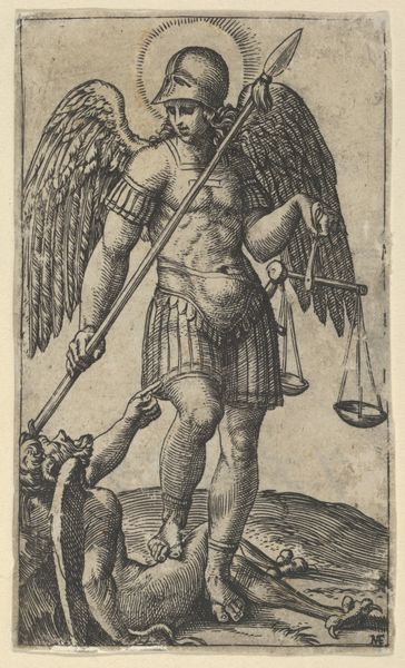 This small print of the Archangel Michael standing on the Devil with spear and scales was made by an anonymous artist. The image of Michael triumphing over evil through divine justice speaks volumes about the religious and social climate in which it was created. We see the visual codes of religious authority, the angel's armour and halo, contrasted with the defeated devil. The scales represent divine judgement, a crucial concept during the religious reformations of the 16th and 17th centuries in the Netherlands. These reformations questioned existing religious institutions. Prints like these served as powerful tools for disseminating specific theological viewpoints. As an art historian, to better understand this print, I would examine the historical context surrounding the production of similar prints, looking at the social function of religious imagery during times of upheaval. What role did the printing press play in shaping religious beliefs and social norms? The meaning of this artwork is contingent on the religious and institutional contexts of its time.
