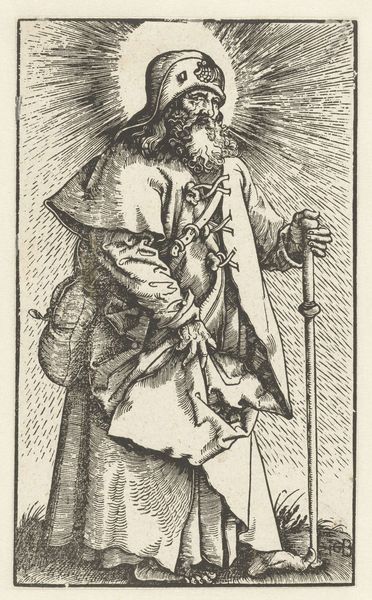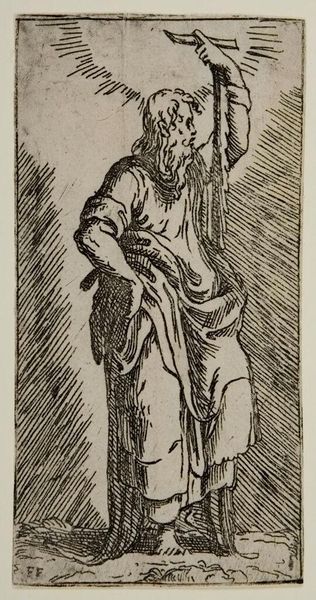 Editor: Here we have an etching of Saint Peter, made by an anonymous artist. It's a simple, linear work, but it feels… weighty. What can you tell me about its historical context? Curator: Well, the keys Peter holds are symbolic. They represent his role as the gatekeeper of Heaven. But what's interesting is how imagery like this was used during periods of religious reform or conflict. How do you think this image might function within such contexts? Editor: Maybe as a reminder of authority, or even a challenge to it, depending on who's commissioning or viewing it? Curator: Precisely! The power of religious imagery lies in its ability to be interpreted and re-interpreted, shaping public opinion and reinforcing institutional narratives. It’s a fascinating case study in the politics of art. Editor: That gives me a lot to think about regarding art’s purpose and interpretation. Thank you!