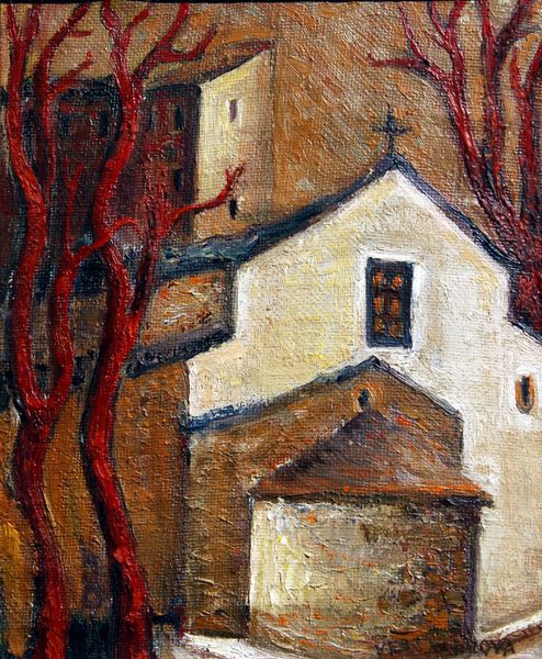 Abraham Manievich's ‘Autumn Day’ offers a vibrant vision of domesticity, thick with oil paint. Its composition is grounded in the Orthodox Christian architecture of Eastern Europe. Note the onion dome, a symbol of spiritual transcendence, emerging from the rooftop. These domes echo the flame, representing the soul's ascent to the heavens. Consider the mosaics of Ravenna; here, the soul, like a mosaic, is formed of many coloured tesserae and is eternal. In Manievich's painting, the colors blend and are obscured by the urban environment. This cultural echo is not merely a visual element; it evokes a deep-seated yearning for the eternal, a collective memory embedded in the very stones of civilization. The expressive brushwork conveys a sense of melancholy, a poignant reminder of the transient nature of earthly existence. See how this powerful symbol, like a flame, has been passed down through history, evolving and taking on new meanings, yet still engaging us on a profound, subconscious level.
