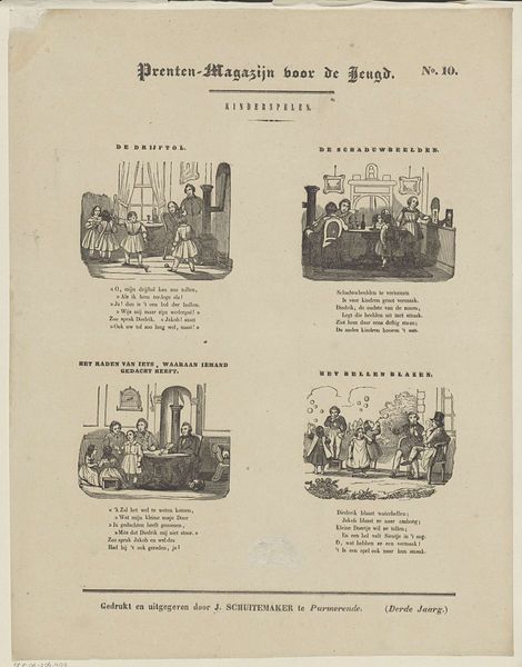 Curator: Let’s discuss this lithograph from between 1850 and 1881, titled "Kinderspelen," by Dirk Noothoven van Goor. Editor: This print showing children at play has a charming, innocent feel, like a snapshot of a simpler time. The scenes are almost like vignettes. How do you interpret this work, especially given its historical context? Curator: This work, made to be disseminated in print, offers insights into 19th-century views on childhood and its role in society. Note how each scene presents a controlled, domestic sphere for children. Consider, what political or societal statements were being conveyed through images such as this? Editor: Well, seeing the image described as Romantic, it contrasts sharply with the reality of working-class children at the time. Perhaps it shows the aspirations of the emerging middle class? A yearning for an ideal childhood? Curator: Precisely. These prints often served to instruct as much as entertain. By depicting idyllic scenes of play and domesticity, they reinforced certain values and norms within a rapidly changing society, almost attempting to preserve innocence amidst industrialization. This can lead us to examine institutions. Who was the intended audience? What role do you think this piece may have played within education? Editor: Perhaps children in wealthy households who were actually given leisure time and proper education. Curator: That’s insightful. And, how did the availability and price point affect viewership? Editor: That brings it all into a new light for me. It's more than just a charming image; it's a reflection of social values and perhaps a desire to shape them. Curator: Exactly. Analyzing the social function of such images allows us a broader understanding of the 19th century's visual culture. It gives great consideration to public roles in the arts.