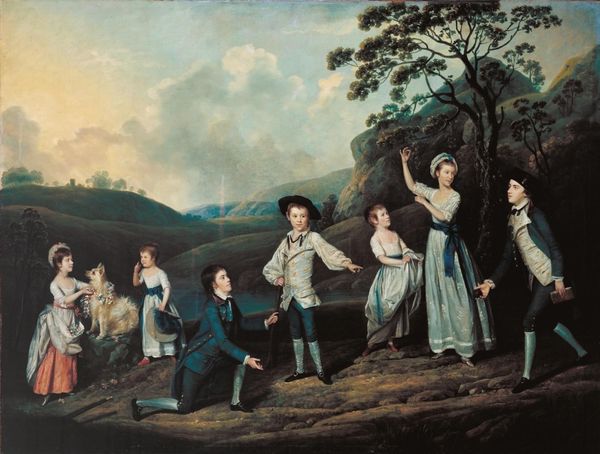 Curator: Here we have Johan Zoffany's painting, "The Bradshaw Family," currently housed at Tate Britain. What strikes you about it? Editor: The sheer amount of fabric! Look at those silks and lace—a veritable textile inventory. You can almost feel the weight and expense of their garments. Curator: Indeed! The clothing speaks volumes about status. Note how the kite soaring overhead acts as a symbol of ambition and the family's aspirations. Editor: But it’s also about production. Think of the labor—the spinning, weaving, dyeing—behind each thread, each embellishment. Curator: And the family's placement beneath the shade of the tree provides a contrast between nature and cultivated wealth. Editor: A tension visualized perfectly in paint. I find myself wondering about Zoffany’s choices—the brushes, the pigments… Curator: It’s a rich tapestry of symbols and materiality, isn’t it? Editor: Absolutely, offering a glimpse into the making of both the artwork and the family's image.
